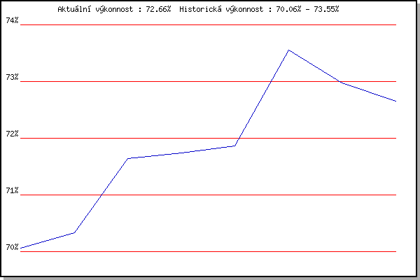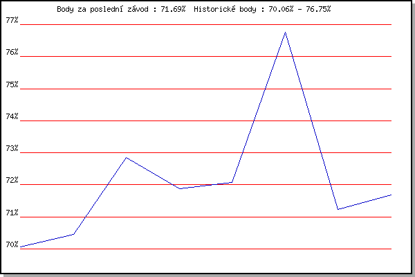 Závod| Body | Výkonnost | Změna | 17.11.2010 | 17.listopadu | 70.06% | 70.06% | | 5.2.2011 | Kanice | 70.46% | 70.34% | +0.28% | 26.3.2011 | Myslivna | 72.86% | 71.64% | +1.30% | 2.4.2011 | Cernohorsky soudek | 71.87% | 71.74% | +0.10% | 3.12.2011 | Okrouhla | 72.07% | 71.86% | +0.12% | 21.1.2012 | Radostice | 76.75% | 73.55% | +1.69% | 4.2.2012 | Kanice | 71.24% | 72.97% | -0.58% | 11.3.2012 | Myslivna | 71.69% | 72.66% | -0.31% | | |
