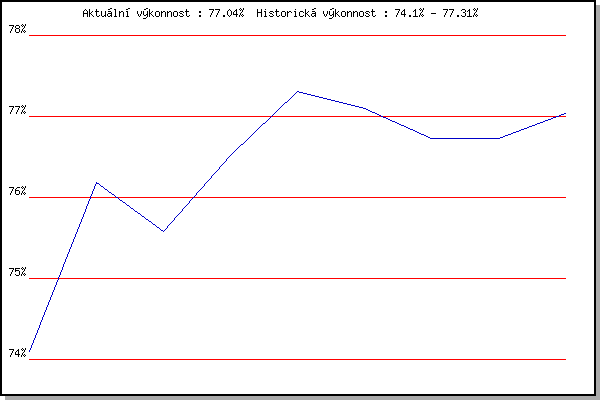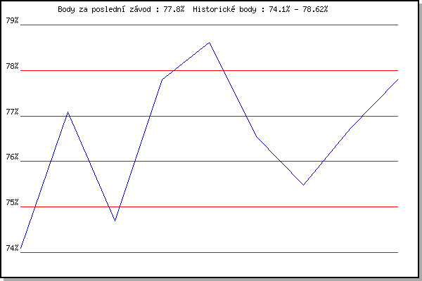 Závod| Body | Výkonnost | Změna | 4.12.2010 | Okrouhla | 74.10% | 74.10% | | 26.12.2010 | Syrovice | 77.09% | 76.19% | +2.09% | 8.1.2011 | Kurim | 74.70% | 75.58% | -0.61% | 22.1.2011 | Radostice | 77.79% | 76.52% | +0.94% | 5.2.2011 | Kanice | 78.62% | 77.31% | +0.79% | 5.3.2011 | Modrice | 76.55% | 77.10% | -0.21% | 3.12.2011 | Okrouhla | 75.48% | 76.73% | -0.37% | 26.12.2011 | Syrovice | 76.73% | 76.73% | 0.00% | 7.1.2012 | Kurim | 77.80% | 77.04% | +0.31% | | |