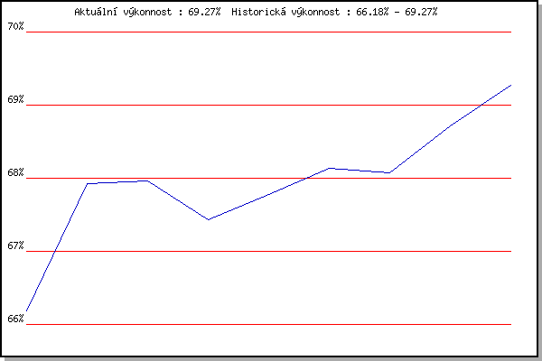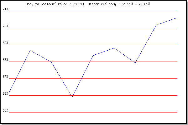 Závod| Body | Výkonnost | Změna | 5.2.2011 | Kanice | 66.18% | 66.18% | | 19.2.2011 | Rajecko | 68.67% | 67.92% | +1.74% | 5.3.2011 | Modrice | 67.99% | 67.96% | +0.04% | 7.1.2012 | Kurim | 65.91% | 67.43% | -0.53% | 4.2.2012 | Kanice | 68.37% | 67.78% | +0.35% | 18.2.2012 | Rajecko | 68.82% | 68.13% | +0.35% | 3.3.2012 | Modrice | 67.92% | 68.08% | -0.05% | 31.3.2012 | Cernohorsky soudek | 70.17% | 68.72% | +0.64% | 9.3.2013 | Modrice | 70.61% | 69.27% | +0.55% | | |