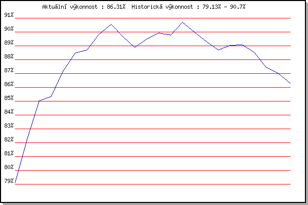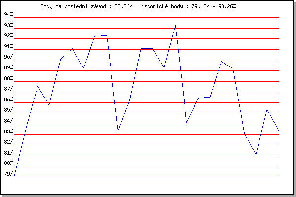 ZávodBodyVýkonnostZměna| 17.11.2011 | Jehnice | 79.13% | 79.13% | | | 3.12.2011 | Okrouhla | 83.72% | 82.35% | +3.22% | | 26.12.2011 | Syrovice | 87.55% | 85.05% | +2.70% | | 7.1.2012 | Kurim | 85.74% | 85.34% | +0.29% | | 21.1.2012 | Radostice | 90.08% | 87.13% | +1.79% | | 4.2.2012 | Kanice | 91.07% | 88.49% | +1.36% | | 18.2.2012 | Rajecko | 89.22% | 88.72% | +0.23% | | 3.3.2012 | Modrice | 92.34% | 89.82% | +1.10% | | 11.3.2012 | Myslivna | 92.30% | 90.54% | +0.72% | | 17.11.2012 | Jehnice | 83.34% | 89.65% | -0.89% | | 1.12.2012 | Okrouhla | 86.16% | 88.90% | -0.75% | | 26.12.2012 | Syrovice | 91.08% | 89.49% | +0.59% | | 5.1.2013 | Kurim | 91.10% | 89.92% | +0.43% | | 19.1.2013 | Radostice | 89.27% | 89.78% | -0.14% | | 2.2.2013 | Rajecko | 93.26% | 90.70% | +0.92% | | 17.11.2013 | Jehnice | 84.11% | 89.99% | -0.71% | | 30.11.2013 | Okrouhla | 86.47% | 89.29% | -0.70% | | 14.12.2013 | Vranovsky zleb | 86.50% | 88.72% | -0.57% | | 26.12.2013 | Syrovice | 89.87% | 89.02% | +0.30% | | 4.1.2014 | Kurim | 89.20% | 89.06% | +0.04% | | 18.1.2014 | Radostice | 83.07% | 88.53% | -0.53% | | 13.12.2014 | Vranovsky zleb | 81.13% | 87.45% | -1.08% | | 17.1.2015 | Radostice | 85.34% | 87.03% | -0.42% | | 9.1.2016 | Kurim | 83.36% | 86.31% | -0.72% | | | | |