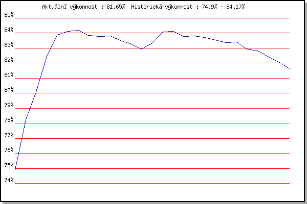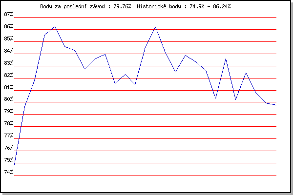 ZávodBodyVýkonnostZměna| 17.11.2011 | Jehnice | 74.90% | 74.90% | | | 21.1.2012 | Radostice | 79.67% | 78.24% | +3.34% | | 11.3.2012 | Myslivna | 81.79% | 80.07% | +1.83% | | 17.11.2012 | Jehnice | 85.57% | 82.44% | +2.37% | | 24.3.2013 | Myslivna | 86.24% | 83.87% | +1.43% | | 6.4.2013 | Soudek Vinice | 84.59% | 84.12% | +0.25% | | 17.11.2013 | Jehnice | 84.28% | 84.17% | +0.05% | | 14.12.2013 | Vranovsky zleb | 82.75% | 83.83% | -0.34% | | 8.2.2014 | Rajecko | 83.59% | 83.77% | -0.06% | | 15.3.2014 | Myslivna | 83.95% | 83.82% | +0.05% | | 13.12.2014 | Vranovsky zleb | 81.54% | 83.51% | -0.31% | | 17.1.2015 | Radostice | 82.31% | 83.25% | -0.26% | | 14.3.2015 | Myslivna | 81.48% | 82.92% | -0.33% | | 12.12.2015 | Vranovsky zleb | 84.50% | 83.34% | +0.42% | | 9.1.2016 | Kurim | 86.19% | 84.08% | +0.74% | | 17.11.2016 | Jehnice | 84.12% | 84.10% | +0.02% | | 17.11.2017 | Jehnice | 82.52% | 83.77% | -0.33% | | 9.12.2017 | Vranovsky zleb | 83.86% | 83.80% | +0.03% | | 6.1.2018 | Kurim | 83.36% | 83.71% | -0.09% | | 20.1.2018 | Radostice | 82.64% | 83.55% | -0.16% | | 17.2.2018 | Modrice | 80.32% | 83.36% | -0.19% | | 10.3.2018 | Myslivna | 83.57% | 83.41% | +0.05% | | 25.3.2018 | Brnenska prehrada | 80.23% | 82.92% | -0.49% | | 17.11.2018 | Jehnice | 82.41% | 82.82% | -0.10% | | 19.1.2019 | Radostice | 80.79% | 82.41% | -0.41% | | 17.11.2019 | Jehnice | 79.92% | 82.07% | -0.34% | | 14.12.2019 | Vranovsky zleb | 79.76% | 81.65% | -0.42% | | | | |
