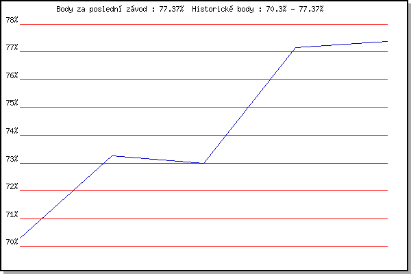 Závod| Body | Výkonnost | Změna | 17.11.2011 | Jehnice | 70.30% | 70.30% | | 26.12.2011 | Syrovice | 73.27% | 72.37% | +2.07% | 21.1.2012 | Radostice | 72.99% | 72.69% | +0.32% | 3.3.2012 | Modrice | 77.16% | 74.62% | +1.93% | 31.3.2012 | Cernohorsky soudek | 77.37% | 75.65% | +1.03% | | |