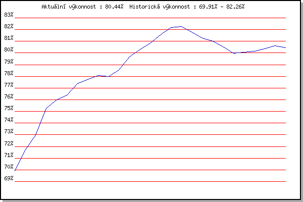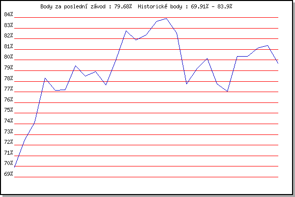 ZávodBodyVýkonnostZměna| 3.12.2011 | Okrouhla | 69.91% | 69.91% | | | 1.12.2012 | Okrouhla | 72.50% | 71.72% | +1.81% | | 2.2.2013 | Rajecko | 74.13% | 72.97% | +1.25% | | 2.3.2013 | Vranovsky zleb | 78.32% | 75.28% | +2.31% | | 9.3.2013 | Modrice | 77.17% | 75.99% | +0.71% | | 17.11.2013 | Jehnice | 77.20% | 76.40% | +0.41% | | 30.11.2013 | Okrouhla | 79.48% | 77.39% | +0.99% | | 14.12.2013 | Vranovsky zleb | 78.51% | 77.73% | +0.34% | | 26.12.2013 | Syrovice | 78.91% | 78.07% | +0.34% | | 4.1.2014 | Kurim | 77.66% | 77.98% | -0.09% | | 18.1.2014 | Radostice | 79.98% | 78.54% | +0.56% | | 8.2.2014 | Rajecko | 82.74% | 79.69% | +1.15% | | 8.3.2014 | Modrice | 81.86% | 80.27% | +0.58% | | 15.3.2014 | Myslivna | 82.36% | 80.82% | +0.55% | | 5.4.2014 | Soudek Vinice | 83.61% | 81.55% | +0.73% | | 6.12.2014 | Okrouhla | 83.90% | 82.16% | +0.61% | | 13.12.2014 | Vranovsky zleb | 82.53% | 82.26% | +0.10% | | 12.3.2016 | Modrice | 77.76% | 81.77% | -0.49% | | 3.12.2016 | Okrouhla | 79.18% | 81.25% | -0.52% | | 7.1.2017 | Kurim | 80.15% | 81.03% | -0.22% | | 2.12.2017 | Okrouhla | 77.77% | 80.52% | -0.51% | | 26.12.2017 | Syrovice | 77.06% | 79.97% | -0.55% | | 6.1.2018 | Kurim | 80.35% | 80.07% | +0.10% | | 20.1.2018 | Radostice | 80.35% | 80.14% | +0.07% | | 27.1.2018 | Rajecko | 81.11% | 80.38% | +0.24% | | 10.3.2018 | Myslivna | 81.34% | 80.62% | +0.24% | | 25.3.2018 | Brnenska prehrada | 79.68% | 80.44% | -0.18% | | | | |