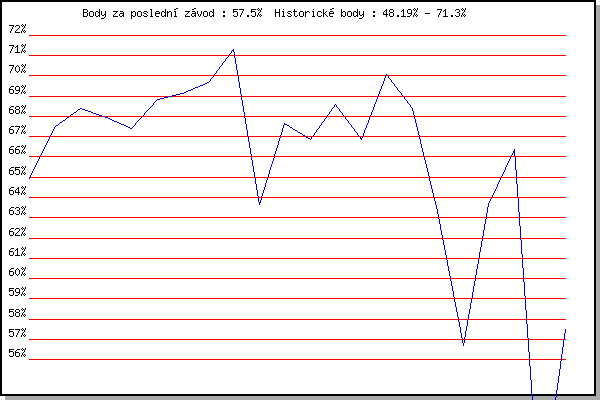 ZávodBodyVýkonnostZměna| 3.3.2012 | Modrice | 64.92% | 64.92% | | | 17.11.2012 | Jehnice | 67.49% | 66.72% | +1.80% | | 1.12.2012 | Okrouhla | 68.38% | 67.57% | +0.85% | | 26.12.2012 | Syrovice | 67.97% | 67.74% | +0.17% | | 19.1.2013 | Radostice | 67.42% | 67.65% | -0.09% | | 2.2.2013 | Rajecko | 68.82% | 68.04% | +0.39% | | 2.3.2013 | Vranovsky zleb | 69.14% | 68.39% | +0.35% | | 9.3.2013 | Modrice | 69.67% | 68.77% | +0.38% | | 24.3.2013 | Myslivna | 71.30% | 69.51% | +0.74% | | 30.11.2013 | Okrouhla | 63.66% | 69.01% | -0.50% | | 26.12.2013 | Syrovice | 67.64% | 68.72% | -0.29% | | 4.1.2014 | Kurim | 66.87% | 68.32% | -0.40% | | 18.1.2014 | Radostice | 68.61% | 68.40% | +0.08% | | 8.2.2014 | Rajecko | 66.88% | 68.08% | -0.32% | | 8.3.2014 | Modrice | 70.08% | 68.60% | +0.52% | | 15.3.2014 | Myslivna | 68.40% | 68.56% | -0.04% | | 7.3.2015 | Modrice | 63.32% | 68.19% | -0.37% | | 26.12.2015 | Syrovice | 56.68% | 67.20% | -0.99% | | 9.1.2016 | Kurim | 63.63% | 66.49% | -0.71% | | 6.2.2016 | Rajecko | 66.37% | 66.47% | -0.02% | | 12.3.2016 | Modrice | 48.19% | 65.18% | -1.29% | | 4.3.2017 | Modrice | 57.50% | 63.70% | -1.48% | | | | |