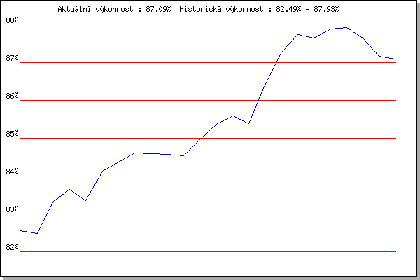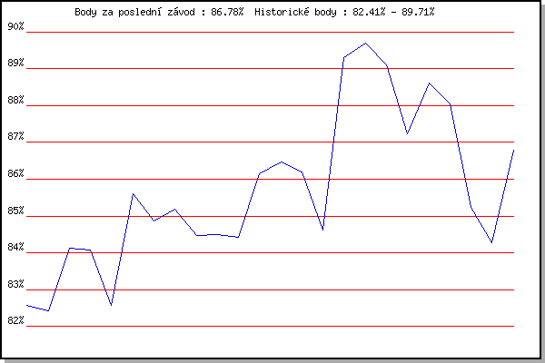 ZávodBodyVýkonnostZměna| 17.11.2012 | Jehnice | 82.56% | 82.56% | | | 1.12.2012 | Okrouhla | 82.41% | 82.49% | -0.07% | | 26.12.2012 | Syrovice | 84.12% | 83.33% | +0.84% | | 5.1.2013 | Kurim | 84.08% | 83.65% | +0.32% | | 19.1.2013 | Radostice | 82.57% | 83.36% | -0.29% | | 2.2.2013 | Rajecko | 85.61% | 84.13% | +0.77% | | 2.3.2013 | Vranovsky zleb | 84.87% | 84.37% | +0.24% | | 9.3.2013 | Modrice | 85.19% | 84.62% | +0.25% | | 17.11.2013 | Jehnice | 84.48% | 84.59% | -0.03% | | 30.11.2013 | Okrouhla | 84.50% | 84.57% | -0.02% | | 14.12.2013 | Vranovsky zleb | 84.42% | 84.53% | -0.04% | | 26.12.2013 | Syrovice | 86.14% | 84.97% | +0.44% | | 4.1.2014 | Kurim | 86.46% | 85.37% | +0.40% | | 18.1.2014 | Radostice | 86.20% | 85.59% | +0.22% | | 15.3.2014 | Myslivna | 84.63% | 85.39% | -0.20% | | 13.12.2014 | Vranovsky zleb | 89.31% | 86.41% | +1.02% | | 26.12.2014 | Syrovice | 89.71% | 87.27% | +0.86% | | 3.1.2015 | Kurim | 89.10% | 87.74% | +0.47% | | 7.2.2015 | Rajecko | 87.24% | 87.64% | -0.10% | | 7.3.2015 | Modrice | 88.61% | 87.88% | +0.24% | | 17.11.2015 | Jehnice | 88.05% | 87.93% | +0.05% | | 26.12.2015 | Syrovice | 85.23% | 87.65% | -0.28% | | 9.1.2016 | Kurim | 84.28% | 87.17% | -0.48% | | 6.2.2016 | Rajecko | 86.78% | 87.09% | -0.08% | | | | |