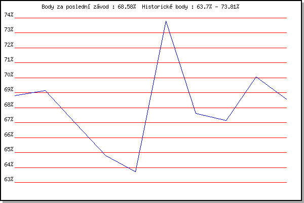 Závod| Body | Výkonnost | Změna | 17.11.2007 | 17.listopadu | 68.81% | 68.81% | | 26.12.2007 | Syrovice | 69.16% | 69.06% | +0.25% | 5.1.2008 | Krenovice | 66.96% | 68.48% | -0.58% | 2.2.2008 | Kanice | 64.81% | 67.60% | -0.88% | 16.2.2008 | Rajecko | 63.70% | 66.66% | -0.94% | 26.12.2008 | Syrovice | 73.81% | 69.16% | +2.50% | 26.12.2009 | Syrovice | 67.62% | 68.77% | -0.39% | 26.12.2011 | Syrovice | 67.14% | 68.39% | -0.38% | 17.11.2012 | Jehnice | 70.06% | 68.88% | +0.49% | 26.12.2012 | Syrovice | 68.58% | 68.81% | -0.07% | | |