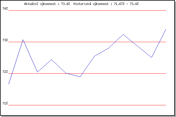 Závod| Body | Výkonnost | Změna | 17.11.2012 | Jehnice | 71.67% | 71.67% | | 5.1.2013 | Kurim | 73.67% | 73.07% | +1.40% | 4.1.2014 | Kurim | 69.91% | 72.05% | -1.02% | 17.11.2014 | Jehnice | 72.96% | 72.44% | +0.39% | 26.12.2014 | Syrovice | 70.98% | 72.01% | -0.43% | 3.1.2015 | Kurim | 71.59% | 71.90% | -0.11% | 14.3.2015 | Myslivna | 73.93% | 72.55% | +0.65% | 17.11.2015 | Jehnice | 73.40% | 72.81% | +0.26% | 6.2.2016 | Rajecko | 74.29% | 73.24% | +0.43% | 19.3.2016 | Myslivna | 70.34% | 72.88% | -0.36% | 7.1.2017 | Kurim | 71.14% | 72.51% | -0.37% | 2.4.2017 | Brnenska prehrada | 75.79% | 73.40% | +0.89% | | |