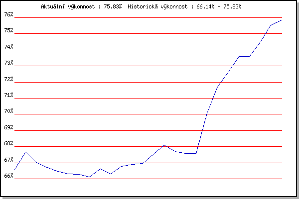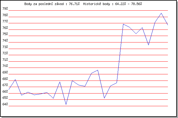 ZávodBodyVýkonnostZměna| 17.11.2012 | Jehnice | 66.59% | 66.59% | | | 17.11.2013 | Jehnice | 68.15% | 67.68% | +1.09% | | 18.1.2014 | Radostice | 65.71% | 67.01% | -0.67% | | 5.4.2014 | Soudek Vinice | 66.17% | 66.72% | -0.29% | | 17.11.2014 | Jehnice | 65.76% | 66.46% | -0.26% | | 13.12.2014 | Vranovsky zleb | 65.89% | 66.31% | -0.15% | | 7.2.2015 | Rajecko | 66.15% | 66.27% | -0.04% | | 7.3.2015 | Modrice | 65.22% | 66.14% | -0.13% | | 14.3.2015 | Myslivna | 67.78% | 66.62% | +0.48% | | 29.3.2015 | Brnenska prehrada | 64.22% | 66.32% | -0.30% | | 17.11.2015 | Jehnice | 67.99% | 66.78% | +0.46% | | 12.12.2015 | Vranovsky zleb | 67.27% | 66.91% | +0.13% | | 26.12.2015 | Syrovice | 67.11% | 66.96% | +0.05% | | 9.1.2016 | Kurim | 69.12% | 67.54% | +0.58% | | 6.2.2016 | Rajecko | 69.67% | 68.10% | +0.56% | | 19.3.2016 | Myslivna | 65.27% | 67.70% | -0.40% | | 3.4.2016 | Brnenska prehrada | 67.13% | 67.58% | -0.12% | | 25.3.2017 | Myslivna | 67.64% | 67.59% | +0.01% | | 17.11.2017 | Jehnice | 76.89% | 70.07% | +2.48% | | 9.12.2017 | Vranovsky zleb | 76.37% | 71.71% | +1.64% | | 26.12.2017 | Syrovice | 75.32% | 72.64% | +0.93% | | 10.3.2018 | Myslivna | 76.31% | 73.58% | +0.94% | | 15.12.2018 | Vranovsky zleb | 73.57% | 73.58% | 0.00% | | 17.11.2019 | Jehnice | 77.15% | 74.49% | +0.91% | | 14.12.2019 | Vranovsky zleb | 78.56% | 75.53% | +1.04% | | 26.12.2019 | Syrovice | 76.71% | 75.83% | +0.30% | | | | |