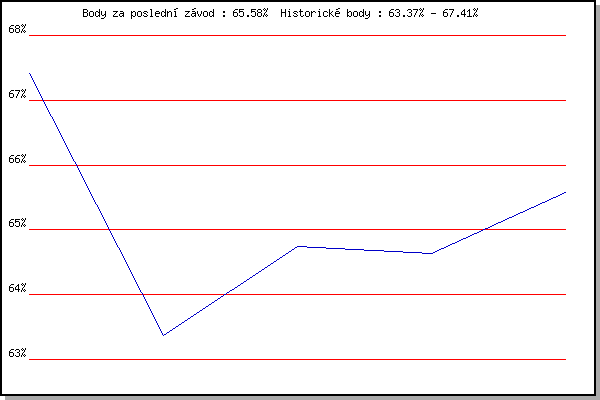 Závod| Body | Výkonnost | Změna | 26.12.2012 | Syrovice | 67.41% | 67.40% | | 5.1.2013 | Kurim | 63.37% | 65.64% | -1.76% | 2.3.2013 | Vranovsky zleb | 64.75% | 65.28% | -0.36% | 6.4.2013 | Soudek Vinice | 64.63% | 65.06% | -0.22% | 8.3.2014 | Modrice | 65.58% | 65.25% | +0.19% | | |