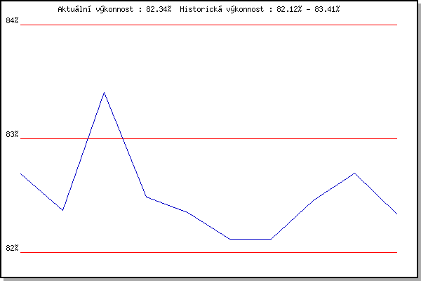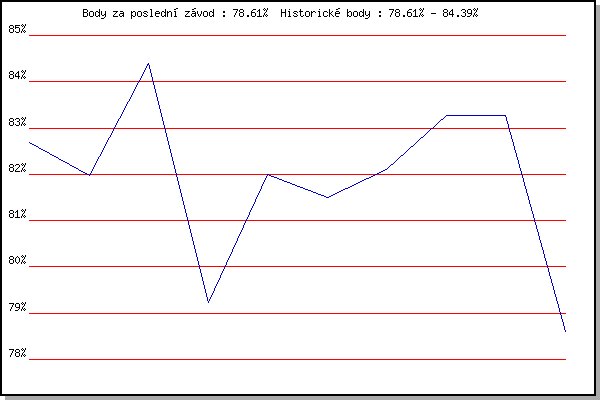 Závod| Body | Výkonnost | Změna | 2.2.2013 | Rajecko | 82.68% | 82.69% | | 30.11.2013 | Okrouhla | 81.97% | 82.37% | -0.32% | 8.2.2014 | Rajecko | 84.39% | 83.41% | +1.04% | 3.12.2016 | Okrouhla | 79.24% | 82.49% | -0.92% | 2.12.2017 | Okrouhla | 81.99% | 82.35% | -0.14% | 17.11.2018 | Jehnice | 81.51% | 82.12% | -0.23% | 15.12.2018 | Vranovsky zleb | 82.10% | 82.12% | 0.00% | 17.11.2019 | Jehnice | 83.27% | 82.46% | +0.34% | 30.11.2019 | Okrouhla | 83.28% | 82.70% | +0.24% | 25.1.2020 | Rajecko | 78.61% | 82.34% | -0.36% | | |