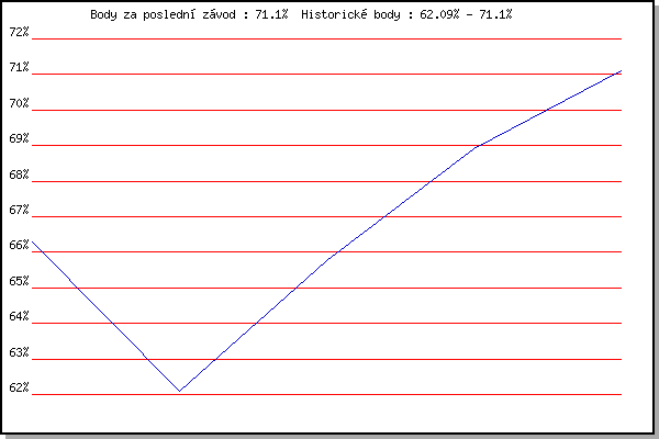 Závod| Body | Výkonnost | Změna | 17.11.2007 | 17.listopadu | 66.28% | 66.28% | | 1.12.2007 | Jehnice | 62.09% | 64.45% | -1.83% | 17.11.2013 | Jehnice | 65.77% | 65.13% | +0.68% | 8.3.2014 | Modrice | 68.91% | 66.76% | +1.63% | 15.3.2014 | Myslivna | 71.10% | 68.41% | +1.65% | | |