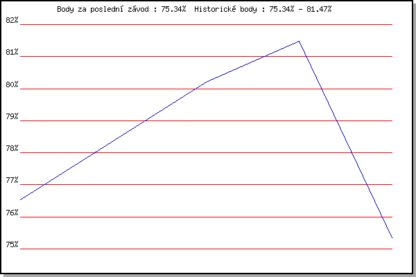 Závod| Body | Výkonnost | Změna | 17.11.2013 | Jehnice | 76.53% | 76.53% | | 26.12.2014 | Syrovice | 78.38% | 77.82% | +1.29% | 5.12.2015 | Okrouhla | 80.21% | 79.05% | +1.23% | 26.12.2015 | Syrovice | 81.47% | 80.09% | +1.04% | 20.1.2018 | Radostice | 75.34% | 79.11% | -0.98% | | |