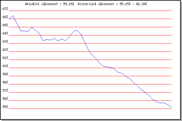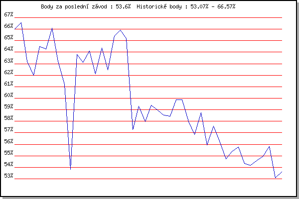 ZávodBodyVýkonnostZměna| 17.11.2007 | 17.listopadu | 65.99% | 65.99% | | | 1.12.2007 | Jehnice | 66.57% | 66.39% | +0.40% | | 5.1.2008 | Krenovice | 63.21% | 65.51% | -0.88% | | 19.1.2008 | Radostice | 61.97% | 64.54% | -0.97% | | 2.2.2008 | Kanice | 64.50% | 64.53% | -0.01% | | 16.2.2008 | Rajecko | 64.28% | 64.46% | -0.07% | | 15.3.2008 | Myslivna | 66.08% | 64.98% | +0.52% | | 6.12.2008 | Jehnice | 63.20% | 64.61% | -0.37% | | 7.3.2009 | Modrice | 61.19% | 64.21% | -0.40% | | 21.3.2009 | Myslivna | 53.83% | 63.35% | -0.86% | | 21.11.2009 | 17.listopadu | 63.80% | 63.47% | +0.12% | | 26.12.2009 | Syrovice | 63.10% | 63.40% | -0.07% | | 9.1.2010 | Kurim | 64.11% | 63.58% | +0.18% | | 23.1.2010 | Radostice | 62.10% | 63.28% | -0.30% | | 6.2.2010 | Kanice | 64.38% | 63.56% | +0.28% | | 20.2.2010 | Rajecko | 62.45% | 63.33% | -0.23% | | 6.3.2010 | Modrice | 65.42% | 63.87% | +0.54% | | 21.3.2010 | Myslivna | 65.92% | 64.40% | +0.53% | | 3.4.2010 | Cernohorsky soudek | 65.20% | 64.61% | +0.21% | | 4.12.2010 | Okrouhla | 57.29% | 64.15% | -0.46% | | 5.2.2011 | Kanice | 59.30% | 63.20% | -0.95% | | 19.2.2011 | Rajecko | 57.97% | 62.18% | -1.02% | | 2.4.2011 | Cernohorsky soudek | 59.39% | 61.63% | -0.55% | | 3.12.2011 | Okrouhla | 58.97% | 61.11% | -0.52% | | 26.12.2011 | Syrovice | 58.54% | 60.60% | -0.51% | | 7.1.2012 | Kurim | 58.43% | 60.17% | -0.43% | | 3.3.2012 | Modrice | 59.87% | 60.11% | -0.06% | | 11.3.2012 | Myslivna | 59.87% | 60.06% | -0.05% | | 31.3.2012 | Cernohorsky soudek | 57.99% | 59.82% | -0.24% | | 1.12.2012 | Okrouhla | 56.86% | 59.46% | -0.36% | | 2.3.2013 | Vranovsky zleb | 58.76% | 59.32% | -0.14% | | 30.11.2013 | Okrouhla | 55.95% | 58.92% | -0.40% | | 26.12.2013 | Syrovice | 57.58% | 58.65% | -0.27% | | 15.3.2014 | Myslivna | 56.28% | 58.19% | -0.46% | | 26.12.2014 | Syrovice | 54.75% | 57.81% | -0.38% | | 14.3.2015 | Myslivna | 55.38% | 57.33% | -0.48% | | 5.12.2015 | Okrouhla | 55.77% | 57.03% | -0.30% | | 6.2.2016 | Rajecko | 54.34% | 56.64% | -0.39% | | 25.3.2017 | Myslivna | 54.19% | 56.19% | -0.45% | | 6.1.2018 | Kurim | 54.60% | 55.87% | -0.32% | | 27.1.2018 | Rajecko | 54.96% | 55.70% | -0.17% | | 1.12.2018 | Okrouhla | 55.83% | 55.73% | +0.03% | | 26.1.2019 | Rajecko | 53.07% | 55.52% | -0.21% | | 16.3.2019 | Myslivna | 53.60% | 55.15% | -0.37% | | | | |