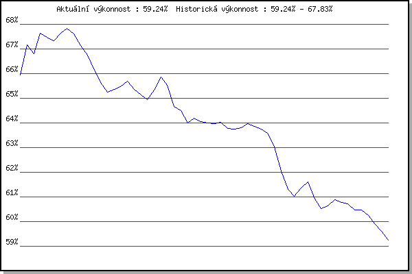 ZávodBodyVýkonnostZměna| 17.11.2007 | 17.listopadu | 65.94% | 65.94% | | | 1.12.2007 | Jehnice | 67.68% | 67.16% | +1.22% | | 26.12.2007 | Syrovice | 66.26% | 66.79% | -0.37% | | 5.1.2008 | Krenovice | 68.77% | 67.64% | +0.85% | | 19.1.2008 | Radostice | 67.09% | 67.48% | -0.16% | | 2.2.2008 | Kanice | 66.90% | 67.32% | -0.16% | | 16.2.2008 | Rajecko | 68.34% | 67.65% | +0.33% | | 1.3.2008 | Modrice | 68.26% | 67.83% | +0.18% | | 29.3.2008 | Cernohorsky soudek | 65.84% | 67.60% | -0.23% | | 22.11.2008 | 17.listopadu | 62.95% | 67.13% | -0.47% | | 6.12.2008 | Jehnice | 65.34% | 66.74% | -0.39% | | 26.12.2008 | Syrovice | 64.17% | 66.20% | -0.54% | | 24.1.2009 | Radostice | 61.40% | 65.63% | -0.57% | | 21.2.2009 | Rajecko | 63.82% | 65.25% | -0.38% | | 7.3.2009 | Modrice | 65.60% | 65.35% | +0.10% | | 21.3.2009 | Myslivna | 65.86% | 65.48% | +0.13% | | 21.11.2009 | 17.listopadu | 66.27% | 65.68% | +0.20% | | 26.12.2009 | Syrovice | 64.03% | 65.35% | -0.33% | | 23.1.2010 | Radostice | 64.35% | 65.15% | -0.20% | | 20.2.2010 | Rajecko | 64.10% | 64.94% | -0.21% | | 6.3.2010 | Modrice | 66.45% | 65.32% | +0.38% | | 3.4.2010 | Cernohorsky soudek | 67.38% | 65.85% | +0.53% | | 4.12.2010 | Okrouhla | 59.09% | 65.54% | -0.31% | | 8.1.2011 | Kurim | 61.03% | 64.66% | -0.88% | | 22.1.2011 | Radostice | 63.91% | 64.51% | -0.15% | | 5.2.2011 | Kanice | 61.94% | 64.01% | -0.50% | | 5.3.2011 | Modrice | 64.74% | 64.20% | +0.19% | | 26.3.2011 | Myslivna | 63.44% | 64.05% | -0.15% | | 3.12.2011 | Okrouhla | 63.77% | 63.99% | -0.06% | | 7.1.2012 | Kurim | 63.91% | 63.98% | -0.01% | | 21.1.2012 | Radostice | 64.16% | 64.02% | +0.04% | | 4.2.2012 | Kanice | 62.85% | 63.79% | -0.23% | | 3.3.2012 | Modrice | 63.58% | 63.75% | -0.04% | | 11.3.2012 | Myslivna | 64.01% | 63.81% | +0.06% | | 31.3.2012 | Cernohorsky soudek | 64.50% | 63.98% | +0.17% | | 19.1.2013 | Radostice | 63.33% | 63.85% | -0.13% | | 24.3.2013 | Myslivna | 62.98% | 63.74% | -0.11% | | 5.12.2015 | Okrouhla | 57.27% | 63.59% | -0.15% | | 26.12.2015 | Syrovice | 60.72% | 63.02% | -0.57% | | 9.1.2016 | Kurim | 53.05% | 62.05% | -0.97% | | 23.1.2016 | Radostice | 58.22% | 61.30% | -0.75% | | 6.2.2016 | Rajecko | 59.89% | 61.02% | -0.28% | | 12.3.2016 | Modrice | 62.37% | 61.37% | +0.35% | | 3.4.2016 | Brnenska prehrada | 62.36% | 61.62% | +0.25% | | 10.12.2016 | Vranovsky zleb | 58.06% | 60.93% | -0.69% | | 21.1.2017 | Radostice | 58.90% | 60.52% | -0.41% | | 11.2.2017 | Rajecko | 60.97% | 60.64% | +0.12% | | 4.3.2017 | Modrice | 61.65% | 60.89% | +0.25% | | 2.12.2017 | Okrouhla | 60.27% | 60.77% | -0.12% | | 9.12.2017 | Vranovsky zleb | 60.51% | 60.72% | -0.05% | | 6.1.2018 | Kurim | 57.50% | 60.46% | -0.26% | | 20.1.2018 | Radostice | 60.49% | 60.47% | +0.01% | | 27.1.2018 | Rajecko | 59.40% | 60.26% | -0.21% | | 17.2.2018 | Modrice | 58.57% | 59.92% | -0.34% | | 10.3.2018 | Myslivna | 57.65% | 59.62% | -0.30% | | 26.1.2019 | Rajecko | 56.98% | 59.24% | -0.38% | | | | |
