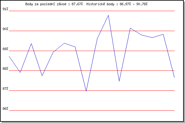 ZávodBodyVýkonnostZměna| 17.11.2007 | 17.listopadu | 88.72% | 88.72% | | | 1.12.2007 | Jehnice | 87.92% | 88.37% | -0.35% | | 26.12.2007 | Syrovice | 89.36% | 88.88% | +0.51% | | 5.1.2008 | Krenovice | 87.75% | 88.56% | -0.32% | | 2.2.2008 | Kanice | 88.93% | 88.69% | +0.13% | | 16.2.2008 | Rajecko | 89.38% | 88.92% | +0.23% | | 1.3.2008 | Modrice | 89.20% | 89.01% | +0.09% | | 15.3.2008 | Myslivna | 86.97% | 88.78% | -0.23% | | 29.3.2008 | Cernohorsky soudek | 89.61% | 89.02% | +0.24% | | 6.12.2008 | Jehnice | 90.78% | 89.52% | +0.50% | | 26.12.2008 | Syrovice | 87.46% | 89.13% | -0.39% | | 21.11.2009 | 17.listopadu | 90.14% | 89.40% | +0.27% | | 17.11.2010 | 17.listopadu | 89.80% | 89.51% | +0.11% | | 17.11.2012 | Jehnice | 89.66% | 89.55% | +0.04% | | 1.12.2012 | Okrouhla | 89.82% | 89.62% | +0.07% | | 17.11.2013 | Jehnice | 87.67% | 89.41% | -0.21% | | | | |