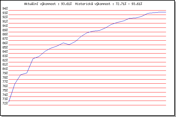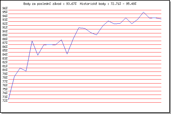 ZávodBodyVýkonnostZměna| 18.1.2014 | Radostice | 72.71% | 72.71% | | | 8.3.2014 | Modrice | 78.76% | 76.97% | +4.26% | | 15.3.2014 | Myslivna | 80.95% | 79.03% | +2.06% | | 5.4.2014 | Soudek Vinice | 80.14% | 79.50% | +0.47% | | 17.11.2014 | Jehnice | 88.02% | 82.77% | +3.27% | | 6.12.2014 | Okrouhla | 84.30% | 83.29% | +0.52% | | 3.1.2015 | Kurim | 86.94% | 84.46% | +1.17% | | 17.1.2015 | Radostice | 87.06% | 85.25% | +0.79% | | 7.2.2015 | Rajecko | 86.94% | 85.74% | +0.49% | | 7.3.2015 | Modrice | 88.30% | 86.47% | +0.73% | | 14.3.2015 | Myslivna | 84.62% | 86.07% | -0.40% | | 29.3.2015 | Brnenska prehrada | 88.42% | 86.71% | +0.64% | | 17.11.2015 | Jehnice | 91.40% | 87.97% | +1.26% | | 5.12.2015 | Okrouhla | 91.22% | 88.83% | +0.86% | | 12.12.2015 | Vranovsky zleb | 90.17% | 89.18% | +0.35% | | 9.1.2016 | Kurim | 89.56% | 89.28% | +0.10% | | 6.2.2016 | Rajecko | 91.75% | 89.92% | +0.64% | | 12.3.2016 | Modrice | 93.19% | 90.76% | +0.84% | | 19.3.2016 | Myslivna | 92.43% | 91.19% | +0.43% | | 3.4.2016 | Brnenska prehrada | 92.52% | 91.53% | +0.34% | | 17.11.2016 | Jehnice | 94.03% | 92.17% | +0.64% | | 3.12.2016 | Okrouhla | 92.47% | 92.24% | +0.07% | | 10.12.2016 | Vranovsky zleb | 93.52% | 92.56% | +0.32% | | 21.1.2017 | Radostice | 95.49% | 93.31% | +0.75% | | 11.2.2017 | Rajecko | 93.91% | 93.46% | +0.15% | | 4.3.2017 | Modrice | 93.98% | 93.59% | +0.13% | | 25.3.2017 | Myslivna | 93.67% | 93.61% | +0.02% | | | | |