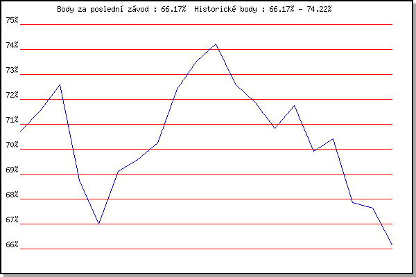 ZávodBodyVýkonnostZměna| 18.1.2014 | Radostice | 70.73% | 70.73% | | | 8.2.2014 | Rajecko | 71.54% | 71.30% | +0.57% | | 8.3.2014 | Modrice | 72.58% | 71.96% | +0.66% | | 17.11.2014 | Jehnice | 68.75% | 71.25% | -0.71% | | 3.1.2015 | Kurim | 67.00% | 70.31% | -0.94% | | 17.1.2015 | Radostice | 69.12% | 69.99% | -0.32% | | 7.3.2015 | Modrice | 69.59% | 69.89% | -0.10% | | 14.3.2015 | Myslivna | 70.25% | 69.99% | +0.10% | | 29.3.2015 | Brnenska prehrada | 72.42% | 70.70% | +0.71% | | 23.1.2016 | Radostice | 73.52% | 71.51% | +0.81% | | 12.3.2016 | Modrice | 74.22% | 72.26% | +0.75% | | 17.11.2016 | Jehnice | 72.61% | 72.35% | +0.09% | | 21.1.2017 | Radostice | 71.89% | 72.26% | -0.09% | | 17.11.2017 | Jehnice | 70.83% | 71.96% | -0.30% | | 6.1.2018 | Kurim | 71.76% | 71.92% | -0.04% | | 20.1.2018 | Radostice | 69.91% | 71.71% | -0.21% | | 17.2.2018 | Modrice | 70.42% | 71.44% | -0.27% | | 17.11.2018 | Jehnice | 67.87% | 71.15% | -0.29% | | 26.12.2018 | Syrovice | 67.65% | 70.50% | -0.65% | | 26.12.2019 | Syrovice | 66.17% | 69.93% | -0.57% | | | | |