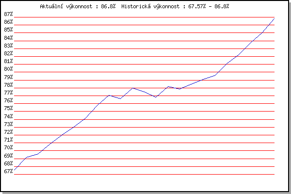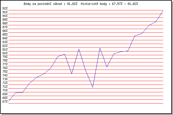 ZávodBodyVýkonnostZměna| 18.1.2014 | Radostice | 67.57% | 67.57% | | | 8.2.2014 | Rajecko | 69.89% | 69.19% | +1.62% | | 8.3.2014 | Modrice | 69.94% | 69.58% | +0.39% | | 17.11.2014 | Jehnice | 72.42% | 70.80% | +1.22% | | 13.12.2014 | Vranovsky zleb | 74.02% | 72.01% | +1.21% | | 26.12.2014 | Syrovice | 74.89% | 73.00% | +0.99% | | 17.11.2015 | Jehnice | 76.42% | 74.09% | +1.09% | | 5.12.2015 | Okrouhla | 79.56% | 75.78% | +1.69% | | 12.12.2015 | Vranovsky zleb | 80.16% | 77.07% | +1.29% | | 6.2.2016 | Rajecko | 74.98% | 76.61% | -0.46% | | 3.12.2016 | Okrouhla | 81.57% | 78.00% | +1.39% | | 10.12.2016 | Vranovsky zleb | 75.72% | 77.52% | -0.48% | | 26.12.2016 | Syrovice | 71.32% | 76.81% | -0.71% | | 7.1.2017 | Kurim | 81.84% | 78.16% | +1.35% | | 17.11.2017 | Jehnice | 76.81% | 77.88% | -0.28% | | 26.12.2017 | Syrovice | 80.26% | 78.50% | +0.62% | | 17.11.2018 | Jehnice | 80.89% | 79.12% | +0.62% | | 1.12.2018 | Okrouhla | 81.01% | 79.61% | +0.49% | | 15.12.2018 | Vranovsky zleb | 85.16% | 81.05% | +1.44% | | 26.12.2018 | Syrovice | 85.71% | 82.26% | +1.21% | | 5.1.2019 | Kurim | 87.87% | 83.71% | +1.45% | | 16.3.2019 | Myslivna | 88.91% | 85.05% | +1.34% | | 18.1.2020 | Radostice | 91.82% | 86.80% | +1.75% | | | | |