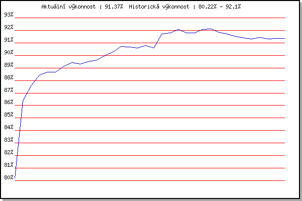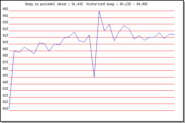 ZávodBodyVýkonnostZměna| 8.2.2014 | Rajecko | 80.23% | 80.22% | | | 17.11.2014 | Jehnice | 88.97% | 86.39% | +6.17% | | 6.12.2014 | Okrouhla | 88.75% | 87.61% | +1.22% | | 3.1.2015 | Kurim | 89.53% | 88.43% | +0.82% | | 17.1.2015 | Radostice | 89.11% | 88.68% | +0.25% | | 7.2.2015 | Rajecko | 88.58% | 88.65% | -0.03% | | 7.3.2015 | Modrice | 90.18% | 89.13% | +0.48% | | 14.3.2015 | Myslivna | 90.07% | 89.41% | +0.28% | | 29.3.2015 | Brnenska prehrada | 88.94% | 89.30% | -0.11% | | 17.11.2015 | Jehnice | 90.02% | 89.50% | +0.20% | | 12.12.2015 | Vranovsky zleb | 89.90% | 89.62% | +0.12% | | 26.12.2015 | Syrovice | 90.91% | 89.97% | +0.35% | | 9.1.2016 | Kurim | 91.13% | 90.28% | +0.31% | | 6.2.2016 | Rajecko | 91.87% | 90.70% | +0.42% | | 12.3.2016 | Modrice | 90.53% | 90.66% | -0.04% | | 17.11.2016 | Jehnice | 90.31% | 90.59% | -0.07% | | 3.12.2016 | Okrouhla | 91.41% | 90.80% | +0.21% | | 10.12.2016 | Vranovsky zleb | 84.95% | 90.59% | -0.21% | | 7.1.2017 | Kurim | 94.99% | 91.73% | +1.14% | | 21.1.2017 | Radostice | 91.97% | 91.79% | +0.06% | | 11.2.2017 | Rajecko | 92.98% | 92.09% | +0.30% | | 25.3.2017 | Myslivna | 90.53% | 91.78% | -0.31% | | 2.4.2017 | Brnenska prehrada | 91.86% | 91.80% | +0.02% | | 17.11.2017 | Jehnice | 92.84% | 92.06% | +0.26% | | 6.1.2018 | Kurim | 92.23% | 92.10% | +0.04% | | 20.1.2018 | Radostice | 90.76% | 91.84% | -0.26% | | 27.1.2018 | Rajecko | 91.29% | 91.73% | -0.11% | | 17.2.2018 | Modrice | 90.57% | 91.50% | -0.23% | | 10.3.2018 | Myslivna | 91.00% | 91.40% | -0.10% | | 1.12.2018 | Okrouhla | 91.01% | 91.32% | -0.08% | | 26.1.2019 | Rajecko | 91.71% | 91.42% | +0.10% | | 30.11.2019 | Okrouhla | 90.82% | 91.31% | -0.11% | | 14.12.2019 | Vranovsky zleb | 91.51% | 91.36% | +0.05% | | 25.1.2020 | Rajecko | 91.43% | 91.37% | +0.01% | | | | |