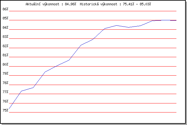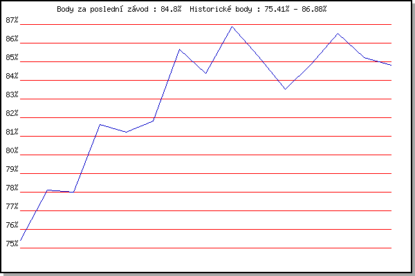 ZávodBodyVýkonnostZměna| 8.2.2014 | Rajecko | 75.41% | 75.41% | | | 8.3.2014 | Modrice | 78.12% | 77.30% | +1.89% | | 15.3.2014 | Myslivna | 78.01% | 77.67% | +0.37% | | 5.12.2015 | Okrouhla | 81.64% | 79.37% | +1.70% | | 26.12.2015 | Syrovice | 81.22% | 80.06% | +0.69% | | 6.2.2016 | Rajecko | 81.83% | 80.67% | +0.61% | | 17.11.2016 | Jehnice | 85.68% | 82.29% | +1.62% | | 7.1.2017 | Kurim | 84.37% | 82.92% | +0.63% | | 17.11.2017 | Jehnice | 86.88% | 84.08% | +1.16% | | 10.3.2018 | Myslivna | 85.31% | 84.42% | +0.34% | | 17.11.2018 | Jehnice | 83.53% | 84.23% | -0.19% | | 5.1.2019 | Kurim | 84.87% | 84.40% | +0.17% | | 7.4.2019 | Brnenska prehrada | 86.50% | 84.96% | +0.56% | | 17.11.2019 | Jehnice | 85.23% | 85.03% | +0.07% | | 4.1.2020 | Kurim | 84.80% | 84.98% | -0.05% | | | | |