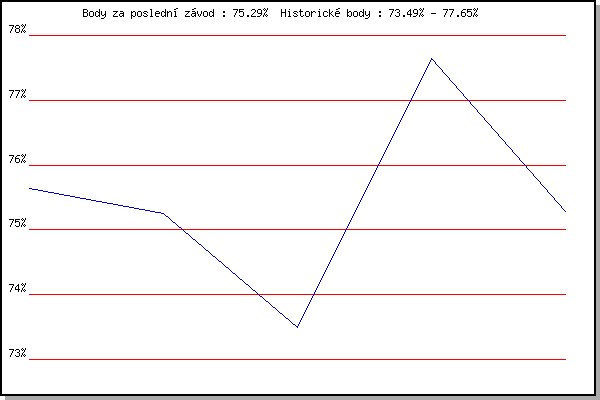 Závod| Body | Výkonnost | Změna | 8.3.2014 | Modrice | 75.64% | 75.64% | | 26.12.2014 | Syrovice | 75.26% | 75.47% | -0.17% | 3.1.2015 | Kurim | 73.49% | 74.93% | -0.54% | 5.12.2015 | Okrouhla | 77.65% | 76.09% | +1.16% | 26.12.2015 | Syrovice | 75.29% | 75.86% | -0.23% | | |