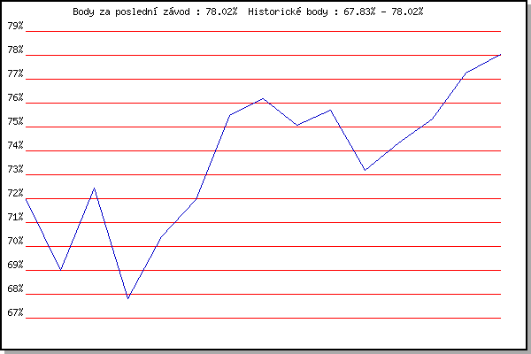 ZávodBodyVýkonnostZměna| 17.11.2014 | Jehnice | 71.95% | 71.95% | | | 6.12.2014 | Okrouhla | 69.01% | 70.65% | -1.30% | | 13.12.2014 | Vranovsky zleb | 72.46% | 71.58% | +0.93% | | 17.1.2015 | Radostice | 67.83% | 70.63% | -0.95% | | 7.3.2015 | Modrice | 70.42% | 70.57% | -0.06% | | 14.3.2015 | Myslivna | 71.95% | 71.04% | +0.47% | | 17.11.2015 | Jehnice | 75.48% | 72.48% | +1.44% | | 5.12.2015 | Okrouhla | 76.19% | 73.61% | +1.13% | | 12.12.2015 | Vranovsky zleb | 75.09% | 74.04% | +0.43% | | 26.12.2015 | Syrovice | 75.72% | 74.51% | +0.47% | | 9.1.2016 | Kurim | 73.18% | 74.22% | -0.29% | | 23.1.2016 | Radostice | 74.35% | 74.26% | +0.04% | | 6.2.2016 | Rajecko | 75.33% | 74.55% | +0.29% | | 19.3.2016 | Myslivna | 77.26% | 75.27% | +0.72% | | 3.4.2016 | Brnenska prehrada | 78.02% | 75.99% | +0.72% | | | | |