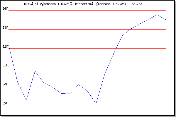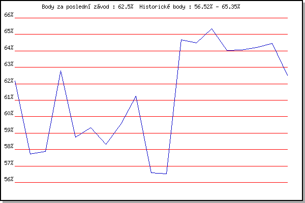 ZávodBodyVýkonnostZměna| 17.11.2007 | 17.listopadu | 62.16% | 62.16% | | | 1.12.2007 | Jehnice | 57.73% | 60.23% | -1.93% | | 26.12.2007 | Syrovice | 57.88% | 59.28% | -0.95% | | 5.1.2008 | Krenovice | 62.78% | 60.79% | +1.51% | | 2.2.2008 | Kanice | 58.75% | 60.19% | -0.60% | | 1.3.2008 | Modrice | 59.32% | 59.96% | -0.23% | | 15.3.2008 | Myslivna | 58.33% | 59.62% | -0.34% | | 29.3.2008 | Cernohorsky soudek | 59.59% | 59.61% | -0.01% | | 6.12.2008 | Jehnice | 61.24% | 60.08% | +0.47% | | 26.12.2008 | Syrovice | 56.59% | 59.75% | -0.33% | | 7.3.2009 | Modrice | 56.52% | 59.08% | -0.67% | | 6.3.2010 | Modrice | 64.68% | 60.63% | +1.55% | | 21.3.2010 | Myslivna | 64.49% | 61.68% | +1.05% | | 3.4.2010 | Cernohorsky soudek | 65.35% | 62.66% | +0.98% | | 22.1.2011 | Radostice | 64.02% | 63.02% | +0.36% | | 5.2.2011 | Kanice | 64.04% | 63.28% | +0.26% | | 5.3.2011 | Modrice | 64.22% | 63.52% | +0.24% | | 2.4.2011 | Cernohorsky soudek | 64.45% | 63.76% | +0.24% | | 26.12.2011 | Syrovice | 62.50% | 63.51% | -0.25% | | | | |