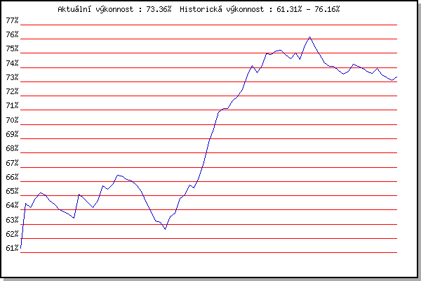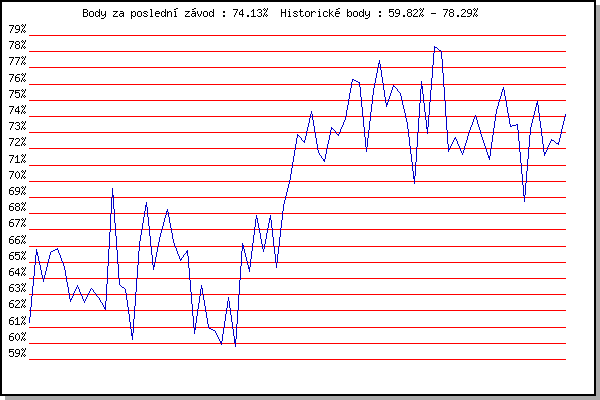 ZávodBodyVýkonnostZměna| 17.11.2007 | 17.listopadu | 61.31% | 61.31% | | | 1.12.2007 | Jehnice | 65.78% | 64.45% | +3.14% | | 26.12.2007 | Syrovice | 63.79% | 64.18% | -0.27% | | 5.1.2008 | Krenovice | 65.59% | 64.78% | +0.60% | | 19.1.2008 | Radostice | 65.85% | 65.18% | +0.40% | | 2.2.2008 | Kanice | 64.70% | 65.05% | -0.13% | | 16.2.2008 | Rajecko | 62.57% | 64.67% | -0.38% | | 1.3.2008 | Modrice | 63.58% | 64.40% | -0.27% | | 15.3.2008 | Myslivna | 62.50% | 64.03% | -0.37% | | 29.3.2008 | Cernohorsky soudek | 63.36% | 63.88% | -0.15% | | 22.11.2008 | 17.listopadu | 62.85% | 63.66% | -0.22% | | 6.12.2008 | Jehnice | 62.11% | 63.44% | -0.22% | | 26.12.2008 | Syrovice | 69.53% | 65.11% | +1.67% | | 24.1.2009 | Radostice | 63.65% | 64.81% | -0.30% | | 7.2.2009 | Kanice | 63.33% | 64.51% | -0.30% | | 21.2.2009 | Rajecko | 60.21% | 64.14% | -0.37% | | 7.3.2009 | Modrice | 66.10% | 64.65% | +0.51% | | 21.3.2009 | Myslivna | 68.69% | 65.70% | +1.05% | | 26.12.2009 | Syrovice | 64.53% | 65.46% | -0.24% | | 23.1.2010 | Radostice | 66.72% | 65.78% | +0.32% | | 6.2.2010 | Kanice | 68.25% | 66.41% | +0.63% | | 20.2.2010 | Rajecko | 66.29% | 66.39% | -0.02% | | 6.3.2010 | Modrice | 65.10% | 66.13% | -0.26% | | 21.3.2010 | Myslivna | 65.70% | 66.05% | -0.08% | | 4.12.2010 | Okrouhla | 60.62% | 65.75% | -0.30% | | 26.12.2010 | Syrovice | 63.57% | 65.31% | -0.44% | | 8.1.2011 | Kurim | 60.98% | 64.51% | -0.80% | | 5.2.2011 | Kanice | 60.72% | 63.82% | -0.69% | | 19.2.2011 | Rajecko | 59.92% | 63.21% | -0.61% | | 5.3.2011 | Modrice | 62.82% | 63.13% | -0.08% | | 2.4.2011 | Cernohorsky soudek | 59.82% | 62.62% | -0.51% | | 17.11.2011 | Jehnice | 66.19% | 63.53% | +0.91% | | 3.12.2011 | Okrouhla | 64.46% | 63.77% | +0.24% | | 26.12.2011 | Syrovice | 67.90% | 64.82% | +1.05% | | 7.1.2012 | Kurim | 65.68% | 65.04% | +0.22% | | 4.2.2012 | Kanice | 67.91% | 65.76% | +0.72% | | 18.2.2012 | Rajecko | 64.71% | 65.55% | -0.21% | | 3.3.2012 | Modrice | 68.44% | 66.29% | +0.74% | | 31.3.2012 | Cernohorsky soudek | 70.25% | 67.30% | +1.01% | | 17.11.2012 | Jehnice | 72.91% | 68.75% | +1.45% | | 5.1.2013 | Kurim | 72.42% | 69.69% | +0.94% | | 19.1.2013 | Radostice | 74.32% | 70.87% | +1.18% | | 2.2.2013 | Rajecko | 71.77% | 71.10% | +0.23% | | 2.3.2013 | Vranovsky zleb | 71.20% | 71.13% | +0.03% | | 9.3.2013 | Modrice | 73.29% | 71.67% | +0.54% | | 24.3.2013 | Myslivna | 72.81% | 71.96% | +0.29% | | 6.4.2013 | Soudek Vinice | 73.87% | 72.44% | +0.48% | | 17.11.2013 | Jehnice | 76.28% | 73.42% | +0.98% | | 30.11.2013 | Okrouhla | 76.12% | 74.11% | +0.69% | | 14.12.2013 | Vranovsky zleb | 71.82% | 73.65% | -0.46% | | 4.1.2014 | Kurim | 75.60% | 74.15% | +0.50% | | 18.1.2014 | Radostice | 77.47% | 74.99% | +0.84% | | 8.2.2014 | Rajecko | 74.59% | 74.91% | -0.08% | | 8.3.2014 | Modrice | 75.89% | 75.16% | +0.25% | | 5.4.2014 | Soudek Vinice | 75.39% | 75.21% | +0.05% | | 17.11.2014 | Jehnice | 73.49% | 74.88% | -0.33% | | 6.12.2014 | Okrouhla | 69.85% | 74.61% | -0.27% | | 13.12.2014 | Vranovsky zleb | 76.16% | 75.00% | +0.39% | | 29.3.2015 | Brnenska prehrada | 72.97% | 74.60% | -0.40% | | 17.11.2015 | Jehnice | 78.29% | 75.54% | +0.94% | | 5.12.2015 | Okrouhla | 77.99% | 76.16% | +0.62% | | 3.4.2016 | Brnenska prehrada | 71.84% | 75.47% | -0.69% | | 26.12.2016 | Syrovice | 72.71% | 74.93% | -0.54% | | 11.2.2017 | Rajecko | 71.67% | 74.35% | -0.58% | | 4.3.2017 | Modrice | 73.09% | 74.10% | -0.25% | | 25.3.2017 | Myslivna | 74.07% | 74.09% | -0.01% | | 17.11.2017 | Jehnice | 72.61% | 73.80% | -0.29% | | 2.12.2017 | Okrouhla | 71.32% | 73.53% | -0.27% | | 26.12.2017 | Syrovice | 74.37% | 73.74% | +0.21% | | 6.1.2018 | Kurim | 75.77% | 74.25% | +0.51% | | 20.1.2018 | Radostice | 73.38% | 74.07% | -0.18% | | 27.1.2018 | Rajecko | 73.49% | 73.96% | -0.11% | | 10.3.2018 | Myslivna | 68.77% | 73.70% | -0.26% | | 25.3.2018 | Brnenska prehrada | 73.26% | 73.61% | -0.09% | | 17.11.2018 | Jehnice | 74.93% | 73.94% | +0.33% | | 26.1.2019 | Rajecko | 71.59% | 73.48% | -0.46% | | 7.4.2019 | Brnenska prehrada | 72.57% | 73.30% | -0.18% | | 25.1.2020 | Rajecko | 72.30% | 73.10% | -0.20% | | 7.3.2020 | Modrice | 74.13% | 73.36% | +0.26% | | | | |