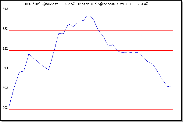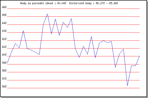 ZávodBodyVýkonnostZměna| 17.1.2015 | Radostice | 59.16% | 59.16% | | | 7.2.2015 | Rajecko | 60.47% | 60.07% | +0.91% | | 7.3.2015 | Modrice | 61.63% | 60.88% | +0.81% | | 14.3.2015 | Myslivna | 61.07% | 60.96% | +0.08% | | 3.12.2016 | Okrouhla | 63.26% | 61.82% | +0.86% | | 7.1.2017 | Kurim | 60.97% | 61.59% | -0.23% | | 4.3.2017 | Modrice | 60.79% | 61.38% | -0.21% | | 25.3.2017 | Myslivna | 60.50% | 61.18% | -0.20% | | 2.4.2017 | Brnenska prehrada | 60.22% | 61.02% | -0.16% | | 17.11.2017 | Jehnice | 64.01% | 61.87% | +0.85% | | 2.12.2017 | Okrouhla | 65.36% | 62.85% | +0.98% | | 9.12.2017 | Vranovsky zleb | 62.82% | 62.84% | -0.01% | | 26.12.2017 | Syrovice | 64.70% | 63.34% | +0.50% | | 6.1.2018 | Kurim | 62.62% | 63.19% | -0.15% | | 20.1.2018 | Radostice | 64.29% | 63.47% | +0.28% | | 27.1.2018 | Rajecko | 63.62% | 63.51% | +0.04% | | 17.2.2018 | Modrice | 64.76% | 63.84% | +0.33% | | 10.3.2018 | Myslivna | 60.93% | 63.58% | -0.26% | | 25.3.2018 | Brnenska prehrada | 59.87% | 63.05% | -0.53% | | 17.11.2018 | Jehnice | 61.29% | 62.70% | -0.35% | | 15.12.2018 | Vranovsky zleb | 60.25% | 62.21% | -0.49% | | 26.12.2018 | Syrovice | 62.50% | 62.28% | +0.07% | | 5.1.2019 | Kurim | 59.83% | 61.94% | -0.34% | | 19.1.2019 | Radostice | 61.66% | 61.89% | -0.05% | | 26.1.2019 | Rajecko | 61.99% | 61.91% | +0.02% | | 16.3.2019 | Myslivna | 61.71% | 61.87% | -0.04% | | 7.4.2019 | Brnenska prehrada | 61.89% | 61.88% | +0.01% | | 17.11.2019 | Jehnice | 58.63% | 61.70% | -0.18% | | 30.11.2019 | Okrouhla | 60.33% | 61.42% | -0.28% | | 26.12.2019 | Syrovice | 60.90% | 61.32% | -0.10% | | 4.1.2020 | Kurim | 56.27% | 60.93% | -0.39% | | 18.1.2020 | Radostice | 58.80% | 60.51% | -0.42% | | 25.1.2020 | Rajecko | 58.81% | 60.17% | -0.34% | | 7.3.2020 | Modrice | 60.04% | 60.15% | -0.02% | | | | |