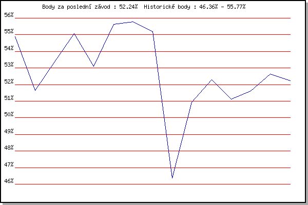 ZávodBodyVýkonnostZměna| 17.11.2007 | 17.listopadu | 54.90% | 54.90% | | | 2.2.2008 | Kanice | 51.66% | 53.49% | -1.41% | | 22.11.2008 | 17.listopadu | 53.36% | 53.43% | -0.06% | | 26.12.2008 | Syrovice | 55.06% | 54.13% | +0.70% | | 7.2.2009 | Kanice | 53.10% | 53.82% | -0.31% | | 7.3.2009 | Modrice | 55.63% | 54.44% | +0.62% | | 4.4.2009 | Cernohorsky soudek | 55.77% | 54.86% | +0.42% | | 26.12.2009 | Syrovice | 55.20% | 54.96% | +0.10% | | 31.3.2012 | Cernohorsky soudek | 46.36% | 54.43% | -0.53% | | 26.12.2012 | Syrovice | 50.95% | 53.67% | -0.76% | | 5.1.2013 | Kurim | 52.31% | 53.38% | -0.29% | | 2.2.2013 | Rajecko | 51.13% | 52.91% | -0.47% | | 9.3.2013 | Modrice | 51.62% | 52.64% | -0.27% | | 24.3.2013 | Myslivna | 52.64% | 52.64% | 0.00% | | 6.4.2013 | Soudek Vinice | 52.24% | 52.55% | -0.09% | | | | |