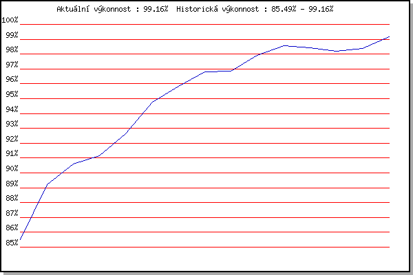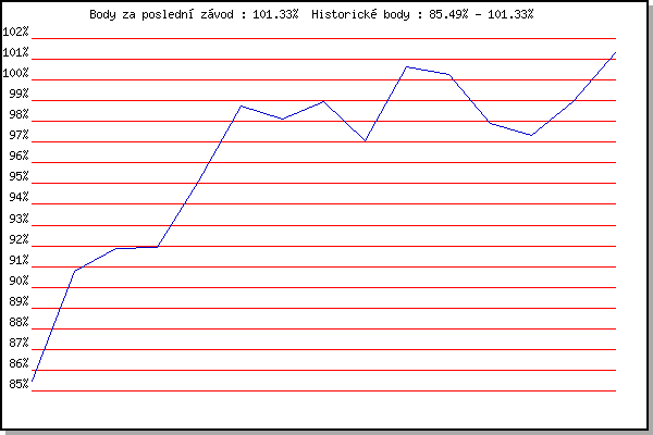 ZávodBodyVýkonnostZměna| 17.11.2015 | Jehnice | 85.49% | 85.49% | | | 21.1.2017 | Radostice | 90.78% | 89.20% | +3.71% | | 11.2.2017 | Rajecko | 91.87% | 90.58% | +1.38% | | 4.3.2017 | Modrice | 91.94% | 91.16% | +0.58% | | 25.3.2017 | Myslivna | 95.14% | 92.66% | +1.50% | | 17.11.2017 | Jehnice | 98.77% | 94.77% | +2.11% | | 2.12.2017 | Okrouhla | 98.13% | 95.85% | +1.08% | | 9.12.2017 | Vranovsky zleb | 98.94% | 96.79% | +0.94% | | 26.12.2017 | Syrovice | 97.07% | 96.87% | +0.08% | | 6.1.2018 | Kurim | 100.62% | 97.93% | +1.06% | | 20.1.2018 | Radostice | 100.24% | 98.57% | +0.64% | | 27.1.2018 | Rajecko | 97.93% | 98.43% | -0.14% | | 17.11.2018 | Jehnice | 97.33% | 98.20% | -0.23% | | 15.12.2018 | Vranovsky zleb | 98.93% | 98.39% | +0.19% | | 19.1.2019 | Radostice | 101.33% | 99.16% | +0.77% | | | | |
