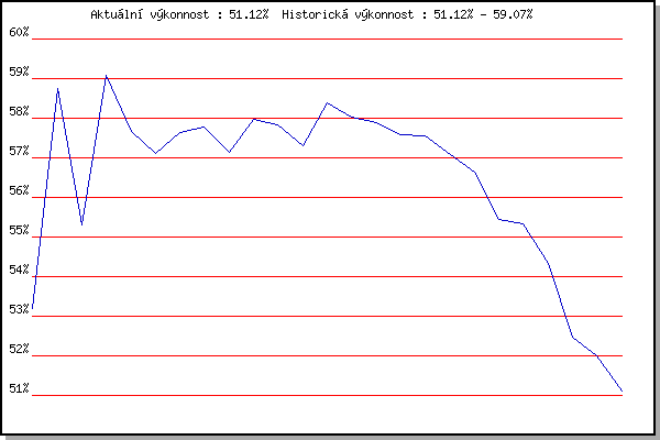 ZávodBodyVýkonnostZměna| 17.11.2007 | 17.listopadu | 53.19% | 53.19% | | | 1.3.2008 | Modrice | 61.05% | 58.75% | +5.56% | | 21.2.2009 | Rajecko | 47.96% | 55.30% | -3.45% | | 7.3.2009 | Modrice | 63.85% | 59.07% | +3.77% | | 20.2.2010 | Rajecko | 54.23% | 57.67% | -1.40% | | 6.3.2010 | Modrice | 55.54% | 57.10% | -0.57% | | 3.4.2010 | Cernohorsky soudek | 58.79% | 57.64% | +0.54% | | 17.11.2010 | 17.listopadu | 58.13% | 57.78% | +0.14% | | 26.12.2010 | Syrovice | 54.94% | 57.14% | -0.64% | | 5.3.2011 | Modrice | 60.08% | 57.98% | +0.84% | | 2.4.2011 | Cernohorsky soudek | 57.29% | 57.83% | -0.15% | | 17.11.2011 | Jehnice | 51.25% | 57.31% | -0.52% | | 3.3.2012 | Modrice | 61.28% | 58.39% | +1.08% | | 2.3.2013 | Vranovsky zleb | 56.61% | 58.02% | -0.37% | | 9.3.2013 | Modrice | 57.44% | 57.90% | -0.12% | | 6.4.2013 | Soudek Vinice | 56.42% | 57.59% | -0.31% | | 8.3.2014 | Modrice | 57.44% | 57.56% | -0.03% | | 15.3.2014 | Myslivna | 46.72% | 57.07% | -0.49% | | 5.4.2014 | Soudek Vinice | 54.90% | 56.64% | -0.43% | | 26.12.2014 | Syrovice | 50.48% | 55.44% | -1.20% | | 7.3.2015 | Modrice | 54.95% | 55.34% | -0.10% | | 17.11.2015 | Jehnice | 43.63% | 54.33% | -1.01% | | 9.12.2017 | Vranovsky zleb | 44.22% | 52.46% | -1.87% | | 17.2.2018 | Modrice | 50.11% | 52.00% | -0.46% | | 9.3.2019 | Modrice | 47.43% | 51.12% | -0.88% | | | | |