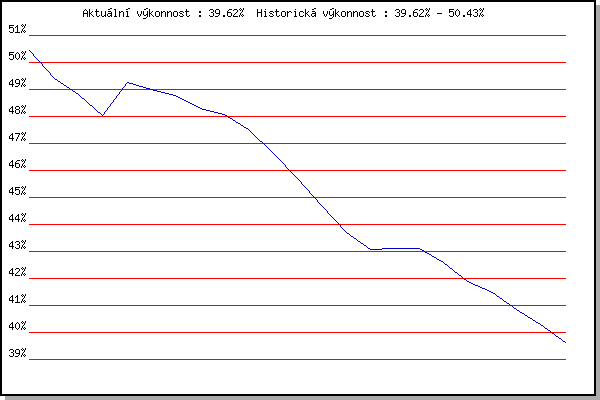 ZávodBodyVýkonnostZměna| 17.11.2007 | 17.listopadu | 50.43% | 50.43% | | | 1.12.2007 | Jehnice | 48.13% | 49.42% | -1.01% | | 15.3.2008 | Myslivna | 47.75% | 48.80% | -0.62% | | 29.3.2008 | Cernohorsky soudek | 45.35% | 48.04% | -0.76% | | 6.12.2008 | Jehnice | 51.21% | 49.24% | +1.20% | | 21.3.2009 | Myslivna | 48.33% | 49.00% | -0.24% | | 4.4.2009 | Cernohorsky soudek | 48.08% | 48.76% | -0.24% | | 3.4.2010 | Cernohorsky soudek | 45.25% | 48.28% | -0.48% | | 17.11.2010 | 17.listopadu | 47.45% | 48.09% | -0.19% | | 19.2.2011 | Rajecko | 43.52% | 47.52% | -0.57% | | 18.2.2012 | Rajecko | 40.59% | 46.62% | -0.90% | | 31.3.2012 | Cernohorsky soudek | 42.22% | 45.71% | -0.91% | | 2.2.2013 | Rajecko | 37.98% | 44.70% | -1.01% | | 2.3.2013 | Vranovsky zleb | 39.67% | 43.69% | -1.01% | | 9.3.2013 | Modrice | 40.64% | 43.08% | -0.61% | | 24.3.2013 | Myslivna | 43.23% | 43.12% | +0.04% | | 17.11.2013 | Jehnice | 43.17% | 43.13% | +0.01% | | 8.3.2014 | Modrice | 37.30% | 42.58% | -0.55% | | 15.3.2014 | Myslivna | 39.08% | 41.89% | -0.69% | | 17.11.2014 | Jehnice | 39.92% | 41.50% | -0.39% | | 7.2.2015 | Rajecko | 36.08% | 40.84% | -0.66% | | 29.3.2015 | Brnenska prehrada | 38.03% | 40.29% | -0.55% | | 17.11.2015 | Jehnice | 36.89% | 39.62% | -0.67% | | | | |