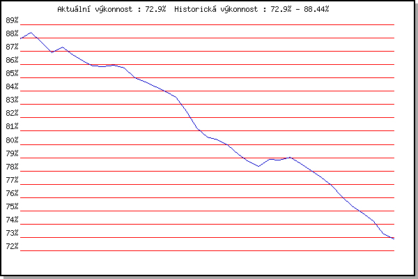 ZávodBodyVýkonnostZměna| 17.11.2007 | 17.listopadu | 87.97% | 87.97% | | | 1.12.2007 | Jehnice | 88.64% | 88.44% | +0.47% | | 26.12.2007 | Syrovice | 85.83% | 87.69% | -0.75% | | 5.1.2008 | Krenovice | 84.95% | 86.91% | -0.78% | | 19.1.2008 | Radostice | 87.94% | 87.30% | +0.39% | | 2.2.2008 | Kanice | 84.86% | 86.76% | -0.54% | | 16.2.2008 | Rajecko | 84.75% | 86.28% | -0.48% | | 1.3.2008 | Modrice | 84.75% | 85.91% | -0.37% | | 15.3.2008 | Myslivna | 85.59% | 85.84% | -0.07% | | 22.11.2008 | 17.listopadu | 86.31% | 85.97% | +0.13% | | 6.12.2008 | Jehnice | 82.34% | 85.73% | -0.24% | | 26.12.2008 | Syrovice | 81.32% | 84.99% | -0.74% | | 24.1.2009 | Radostice | 83.60% | 84.70% | -0.29% | | 7.2.2009 | Kanice | 82.98% | 84.34% | -0.36% | | 21.3.2009 | Myslivna | 82.42% | 83.95% | -0.39% | | 21.11.2009 | 17.listopadu | 78.45% | 83.55% | -0.40% | | 5.12.2009 | Okrouhla | 73.88% | 82.51% | -1.04% | | 26.12.2009 | Syrovice | 76.11% | 81.25% | -1.26% | | 9.1.2010 | Kurim | 77.83% | 80.57% | -0.68% | | 23.1.2010 | Radostice | 79.56% | 80.36% | -0.21% | | 20.2.2010 | Rajecko | 78.26% | 79.94% | -0.42% | | 6.3.2010 | Modrice | 73.69% | 79.25% | -0.69% | | 3.4.2010 | Cernohorsky soudek | 76.69% | 78.74% | -0.51% | | 26.12.2010 | Syrovice | 76.77% | 78.35% | -0.39% | | 8.1.2011 | Kurim | 80.43% | 78.87% | +0.52% | | 22.1.2011 | Radostice | 78.58% | 78.82% | -0.05% | | 5.2.2011 | Kanice | 79.62% | 79.02% | +0.20% | | 5.3.2011 | Modrice | 74.11% | 78.56% | -0.46% | | 17.11.2011 | Jehnice | 75.76% | 78.01% | -0.55% | | 3.12.2011 | Okrouhla | 75.38% | 77.49% | -0.52% | | 17.11.2013 | Jehnice | 72.59% | 76.92% | -0.57% | | 26.12.2013 | Syrovice | 72.49% | 76.07% | -0.85% | | 4.1.2014 | Kurim | 71.66% | 75.37% | -0.70% | | 8.2.2014 | Rajecko | 72.72% | 74.85% | -0.52% | | 26.12.2015 | Syrovice | 69.16% | 74.26% | -0.59% | | 23.1.2016 | Radostice | 57.33% | 73.27% | -0.99% | | 26.12.2016 | Syrovice | 71.43% | 72.90% | -0.37% | | | | |