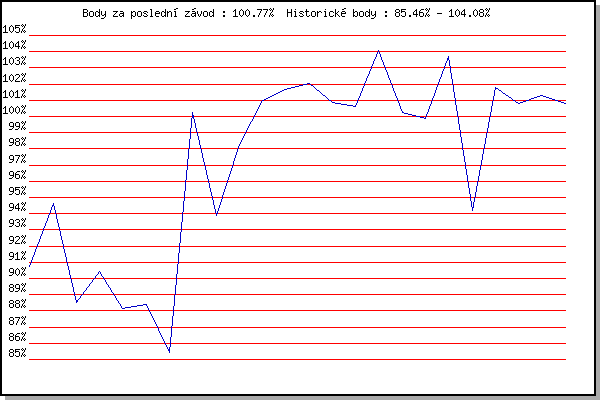 ZávodBodyVýkonnostZměna| 1.12.2007 | Jehnice | 90.76% | 90.76% | | | 26.12.2007 | Syrovice | 94.63% | 93.46% | +2.70% | | 7.3.2009 | Modrice | 88.52% | 91.79% | -1.67% | | 21.3.2009 | Myslivna | 90.41% | 91.33% | -0.46% | | 4.4.2009 | Cernohorsky soudek | 88.14% | 90.57% | -0.76% | | 21.11.2009 | 17.listopadu | 88.42% | 89.99% | -0.58% | | 21.3.2010 | Myslivna | 85.46% | 89.36% | -0.63% | | 17.11.2010 | 17.listopadu | 100.23% | 92.76% | +3.40% | | 5.3.2011 | Modrice | 93.86% | 93.08% | +0.32% | | 26.3.2011 | Myslivna | 98.27% | 94.56% | +1.48% | | 17.11.2011 | Jehnice | 100.99% | 96.36% | +1.80% | | 26.12.2011 | Syrovice | 101.67% | 97.82% | +1.46% | | 7.1.2012 | Kurim | 102.05% | 98.95% | +1.13% | | 21.1.2012 | Radostice | 100.85% | 99.45% | +0.50% | | 4.2.2012 | Kanice | 100.62% | 99.76% | +0.31% | | 18.2.2012 | Rajecko | 104.08% | 100.89% | +1.13% | | 3.3.2012 | Modrice | 100.26% | 100.76% | -0.13% | | 31.3.2012 | Cernohorsky soudek | 99.87% | 100.58% | -0.18% | | 17.11.2012 | Jehnice | 103.70% | 101.38% | +0.80% | | 5.4.2014 | Soudek Vinice | 94.21% | 100.74% | -0.64% | | 17.11.2018 | Jehnice | 101.79% | 101.01% | +0.27% | | 26.12.2018 | Syrovice | 100.81% | 100.97% | -0.04% | | 19.1.2019 | Radostice | 101.29% | 101.05% | +0.08% | | 26.1.2019 | Rajecko | 100.77% | 100.99% | -0.06% | | | | |