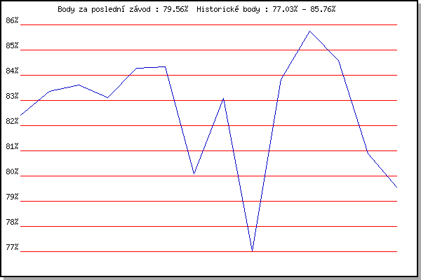 ZávodBodyVýkonnostZměna| 1.12.2007 | Jehnice | 82.42% | 82.41% | | | 26.12.2007 | Syrovice | 83.36% | 83.07% | +0.66% | | 16.2.2008 | Rajecko | 83.60% | 83.34% | +0.27% | | 1.3.2008 | Modrice | 83.11% | 83.26% | -0.08% | | 6.12.2008 | Jehnice | 84.27% | 83.64% | +0.38% | | 24.1.2009 | Radostice | 84.32% | 83.87% | +0.23% | | 21.2.2009 | Rajecko | 80.08% | 83.49% | -0.38% | | 21.11.2009 | 17.listopadu | 83.08% | 83.39% | -0.10% | | 5.12.2009 | Okrouhla | 77.03% | 82.66% | -0.73% | | 11.3.2012 | Myslivna | 83.82% | 82.99% | +0.33% | | 15.3.2014 | Myslivna | 85.76% | 83.76% | +0.77% | | 9.1.2016 | Kurim | 84.59% | 83.98% | +0.22% | | 17.11.2018 | Jehnice | 80.89% | 83.34% | -0.64% | | 9.3.2019 | Modrice | 79.56% | 82.73% | -0.61% | | | | |