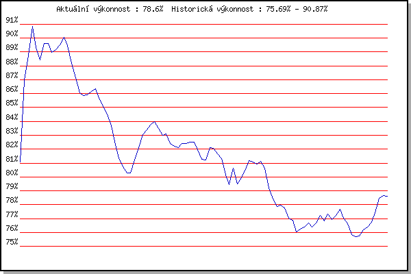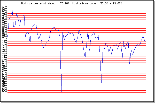 ZávodBodyVýkonnostZměna| 1.12.2007 | Jehnice | 81.08% | 81.08% | | | 5.1.2008 | Krenovice | 89.42% | 86.96% | +5.88% | | 19.1.2008 | Radostice | 90.43% | 88.76% | +1.80% | | 2.2.2008 | Kanice | 93.67% | 90.87% | +2.11% | | 16.2.2008 | Rajecko | 85.59% | 89.34% | -1.53% | | 1.3.2008 | Modrice | 85.89% | 88.41% | -0.93% | | 6.12.2008 | Jehnice | 92.22% | 89.63% | +1.22% | | 26.12.2008 | Syrovice | 89.46% | 89.59% | -0.04% | | 24.1.2009 | Radostice | 85.99% | 88.97% | -0.62% | | 7.2.2009 | Kanice | 89.62% | 89.15% | +0.18% | | 21.2.2009 | Rajecko | 90.44% | 89.50% | +0.35% | | 7.3.2009 | Modrice | 91.62% | 90.08% | +0.58% | | 21.11.2009 | 17.listopadu | 81.13% | 89.49% | -0.59% | | 26.12.2009 | Syrovice | 83.12% | 88.20% | -1.29% | | 9.1.2010 | Kurim | 82.98% | 87.14% | -1.06% | | 23.1.2010 | Radostice | 77.99% | 86.05% | -1.09% | | 6.2.2010 | Kanice | 84.99% | 85.84% | -0.21% | | 20.2.2010 | Rajecko | 86.10% | 85.91% | +0.07% | | 6.3.2010 | Modrice | 86.92% | 86.16% | +0.25% | | 21.3.2010 | Myslivna | 87.00% | 86.38% | +0.22% | | 3.4.2010 | Cernohorsky soudek | 82.71% | 85.66% | -0.72% | | 4.12.2010 | Okrouhla | 79.65% | 85.06% | -0.60% | | 26.12.2010 | Syrovice | 82.48% | 84.55% | -0.51% | | 8.1.2011 | Kurim | 77.86% | 83.70% | -0.85% | | 5.2.2011 | Kanice | 75.89% | 82.55% | -1.15% | | 19.2.2011 | Rajecko | 76.30% | 81.34% | -1.21% | | 5.3.2011 | Modrice | 78.19% | 80.72% | -0.62% | | 26.3.2011 | Myslivna | 78.67% | 80.31% | -0.41% | | 2.4.2011 | Cernohorsky soudek | 80.13% | 80.27% | -0.04% | | 17.11.2011 | Jehnice | 83.96% | 81.22% | +0.95% | | 3.12.2011 | Okrouhla | 84.73% | 82.11% | +0.89% | | 26.12.2011 | Syrovice | 85.79% | 83.05% | +0.94% | | 7.1.2012 | Kurim | 84.45% | 83.40% | +0.35% | | 4.2.2012 | Kanice | 84.79% | 83.75% | +0.35% | | 18.2.2012 | Rajecko | 84.72% | 83.99% | +0.24% | | 11.3.2012 | Myslivna | 81.02% | 83.49% | -0.50% | | 31.3.2012 | Cernohorsky soudek | 55.30% | 83.00% | -0.49% | | 17.11.2012 | Jehnice | 83.44% | 83.11% | +0.11% | | 1.12.2012 | Okrouhla | 79.47% | 82.40% | -0.71% | | 26.12.2012 | Syrovice | 81.43% | 82.20% | -0.20% | | 5.1.2013 | Kurim | 81.85% | 82.13% | -0.07% | | 2.2.2013 | Rajecko | 83.18% | 82.40% | +0.27% | | 2.3.2013 | Vranovsky zleb | 82.44% | 82.41% | +0.01% | | 24.3.2013 | Myslivna | 82.88% | 82.52% | +0.11% | | 6.4.2013 | Soudek Vinice | 82.39% | 82.50% | -0.02% | | 17.11.2013 | Jehnice | 79.76% | 81.96% | -0.54% | | 30.11.2013 | Okrouhla | 78.23% | 81.28% | -0.68% | | 14.12.2013 | Vranovsky zleb | 80.92% | 81.21% | -0.07% | | 26.12.2013 | Syrovice | 84.66% | 82.09% | +0.88% | | 4.1.2014 | Kurim | 82.01% | 82.07% | -0.02% | | 8.2.2014 | Rajecko | 80.10% | 81.68% | -0.39% | | 8.3.2014 | Modrice | 75.26% | 81.32% | -0.36% | | 15.3.2014 | Myslivna | 71.24% | 80.14% | -1.18% | | 5.4.2014 | Soudek Vinice | 76.49% | 79.43% | -0.71% | | 17.11.2014 | Jehnice | 84.16% | 80.63% | +1.20% | | 6.12.2014 | Okrouhla | 74.78% | 79.50% | -1.13% | | 13.12.2014 | Vranovsky zleb | 81.28% | 79.95% | +0.45% | | 26.12.2014 | Syrovice | 81.91% | 80.44% | +0.49% | | 3.1.2015 | Kurim | 83.30% | 81.17% | +0.73% | | 7.2.2015 | Rajecko | 80.62% | 81.06% | -0.11% | | 7.3.2015 | Modrice | 80.31% | 80.91% | -0.15% | | 14.3.2015 | Myslivna | 81.69% | 81.10% | +0.19% | | 29.3.2015 | Brnenska prehrada | 73.02% | 80.65% | -0.45% | | 5.12.2015 | Okrouhla | 59.55% | 79.18% | -1.47% | | 26.12.2015 | Syrovice | 75.23% | 78.41% | -0.77% | | 9.1.2016 | Kurim | 75.59% | 77.85% | -0.56% | | 23.1.2016 | Radostice | 78.26% | 77.96% | +0.11% | | 6.2.2016 | Rajecko | 77.05% | 77.78% | -0.18% | | 3.4.2016 | Brnenska prehrada | 73.87% | 77.01% | -0.77% | | 17.11.2016 | Jehnice | 76.39% | 76.88% | -0.13% | | 3.12.2016 | Okrouhla | 72.63% | 76.05% | -0.83% | | 10.12.2016 | Vranovsky zleb | 76.89% | 76.26% | +0.21% | | 26.12.2016 | Syrovice | 76.86% | 76.41% | +0.15% | | 7.1.2017 | Kurim | 77.43% | 76.67% | +0.26% | | 4.3.2017 | Modrice | 75.26% | 76.39% | -0.28% | | 25.3.2017 | Myslivna | 77.62% | 76.70% | +0.31% | | 2.4.2017 | Brnenska prehrada | 78.75% | 77.22% | +0.52% | | 17.11.2017 | Jehnice | 70.97% | 76.82% | -0.40% | | 2.12.2017 | Okrouhla | 78.81% | 77.32% | +0.50% | | 6.1.2018 | Kurim | 75.36% | 76.94% | -0.38% | | 27.1.2018 | Rajecko | 78.02% | 77.21% | +0.27% | | 10.3.2018 | Myslivna | 79.06% | 77.68% | +0.47% | | 17.11.2018 | Jehnice | 68.39% | 77.03% | -0.65% | | 15.12.2018 | Vranovsky zleb | 74.94% | 76.62% | -0.41% | | 26.12.2018 | Syrovice | 72.72% | 75.86% | -0.76% | | 5.1.2019 | Kurim | 75.04% | 75.69% | -0.17% | | 9.3.2019 | Modrice | 75.95% | 75.76% | +0.07% | | 16.3.2019 | Myslivna | 77.53% | 76.20% | +0.44% | | 7.4.2019 | Brnenska prehrada | 77.01% | 76.41% | +0.21% | | 30.11.2019 | Okrouhla | 77.68% | 76.73% | +0.32% | | 14.12.2019 | Vranovsky zleb | 79.55% | 77.44% | +0.71% | | 26.12.2019 | Syrovice | 81.41% | 78.45% | +1.01% | | 4.1.2020 | Kurim | 79.37% | 78.68% | +0.23% | | 25.1.2020 | Rajecko | 78.28% | 78.60% | -0.08% | | | | |