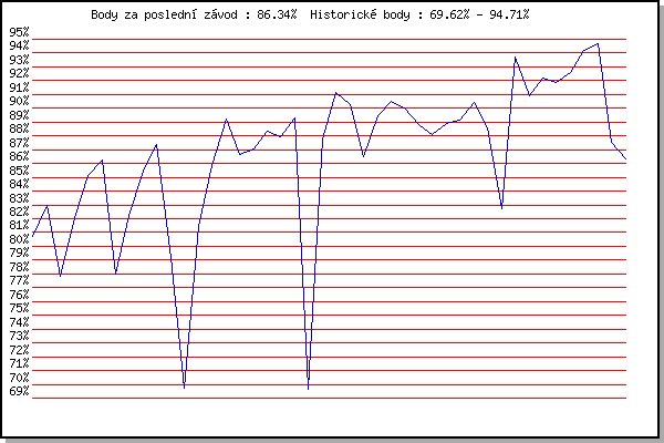 ZávodBodyVýkonnostZměna| 1.12.2007 | Jehnice | 80.69% | 80.69% | | | 1.3.2008 | Modrice | 83.00% | 82.30% | +1.61% | | 6.12.2008 | Jehnice | 77.82% | 80.91% | -1.39% | | 26.12.2008 | Syrovice | 82.10% | 81.42% | +0.51% | | 7.2.2009 | Kanice | 85.10% | 82.81% | +1.39% | | 21.2.2009 | Rajecko | 86.22% | 83.98% | +1.17% | | 21.11.2009 | 17.listopadu | 77.97% | 82.96% | -1.02% | | 5.12.2009 | Okrouhla | 82.26% | 82.79% | -0.17% | | 26.12.2009 | Syrovice | 85.44% | 83.56% | +0.77% | | 6.2.2010 | Kanice | 87.40% | 84.66% | +1.10% | | 20.2.2010 | Rajecko | 79.19% | 83.79% | -0.87% | | 17.11.2010 | 17.listopadu | 69.71% | 82.66% | -1.13% | | 4.12.2010 | Okrouhla | 81.44% | 82.41% | -0.25% | | 26.12.2010 | Syrovice | 85.85% | 83.32% | +0.91% | | 8.1.2011 | Kurim | 89.22% | 84.89% | +1.57% | | 22.1.2011 | Radostice | 86.66% | 85.35% | +0.46% | | 5.2.2011 | Kanice | 87.06% | 85.78% | +0.43% | | 19.2.2011 | Rajecko | 88.33% | 86.44% | +0.66% | | 26.12.2011 | Syrovice | 87.96% | 86.83% | +0.39% | | 18.2.2012 | Rajecko | 89.29% | 87.46% | +0.63% | | 17.11.2012 | Jehnice | 69.62% | 86.57% | -0.89% | | 26.12.2012 | Syrovice | 87.81% | 86.88% | +0.31% | | 5.1.2013 | Kurim | 91.14% | 87.98% | +1.10% | | 19.1.2013 | Radostice | 90.28% | 88.56% | +0.58% | | 17.11.2013 | Jehnice | 86.49% | 88.15% | -0.41% | | 30.11.2013 | Okrouhla | 89.47% | 88.48% | +0.33% | | 26.12.2013 | Syrovice | 90.48% | 88.99% | +0.51% | | 4.1.2014 | Kurim | 90.00% | 89.24% | +0.25% | | 18.1.2014 | Radostice | 88.79% | 89.15% | -0.09% | | 8.3.2014 | Modrice | 88.13% | 88.95% | -0.20% | | 17.11.2014 | Jehnice | 88.90% | 88.94% | -0.01% | | 6.12.2014 | Okrouhla | 89.14% | 88.99% | +0.05% | | 13.12.2014 | Vranovsky zleb | 90.42% | 89.35% | +0.36% | | 17.1.2015 | Radostice | 88.56% | 89.19% | -0.16% | | 12.12.2015 | Vranovsky zleb | 82.70% | 88.88% | -0.31% | | 17.11.2016 | Jehnice | 93.70% | 90.11% | +1.23% | | 26.12.2016 | Syrovice | 90.93% | 90.32% | +0.21% | | 7.1.2017 | Kurim | 92.19% | 90.79% | +0.47% | | 11.2.2017 | Rajecko | 91.83% | 91.05% | +0.26% | | 6.1.2018 | Kurim | 92.61% | 91.44% | +0.39% | | 27.1.2018 | Rajecko | 94.18% | 92.14% | +0.70% | | 10.3.2018 | Myslivna | 94.71% | 92.78% | +0.64% | | 17.11.2018 | Jehnice | 87.57% | 92.11% | -0.67% | | 4.1.2020 | Kurim | 86.34% | 91.22% | -0.89% | | | | |