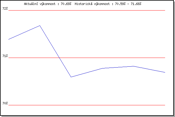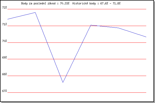 Závod| Body | Výkonnost | Změna | 17.11.2016 | Jehnice | 71.39% | 71.39% | | 3.12.2016 | Okrouhla | 71.80% | 71.68% | +0.29% | 26.12.2016 | Syrovice | 67.60% | 70.59% | -1.09% | 7.1.2017 | Kurim | 71.04% | 70.78% | +0.19% | 21.1.2017 | Radostice | 70.87% | 70.82% | +0.04% | 11.2.2017 | Rajecko | 70.33% | 70.69% | -0.13% | | |