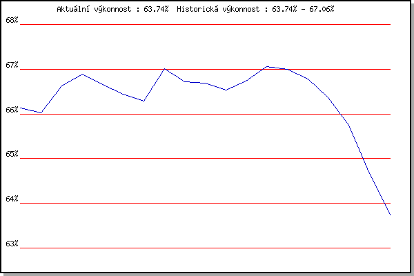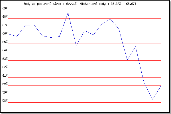 ZávodBodyVýkonnostZměna| 17.11.2016 | Jehnice | 66.13% | 66.14% | | | 3.12.2016 | Okrouhla | 65.86% | 66.02% | -0.12% | | 10.12.2016 | Vranovsky zleb | 67.21% | 66.63% | +0.61% | | 26.12.2016 | Syrovice | 67.24% | 66.89% | +0.26% | | 11.2.2017 | Rajecko | 65.95% | 66.65% | -0.24% | | 4.3.2017 | Modrice | 65.74% | 66.44% | -0.21% | | 25.3.2017 | Myslivna | 65.83% | 66.29% | -0.15% | | 17.11.2017 | Jehnice | 68.67% | 67.01% | +0.72% | | 9.12.2017 | Vranovsky zleb | 64.80% | 66.72% | -0.29% | | 26.12.2017 | Syrovice | 66.56% | 66.68% | -0.04% | | 6.1.2018 | Kurim | 66.04% | 66.54% | -0.14% | | 17.2.2018 | Modrice | 67.30% | 66.74% | +0.20% | | 10.3.2018 | Myslivna | 67.93% | 67.06% | +0.32% | | 17.11.2018 | Jehnice | 66.78% | 67.00% | -0.06% | | 26.1.2019 | Rajecko | 63.06% | 66.78% | -0.22% | | 9.3.2019 | Modrice | 64.66% | 66.36% | -0.42% | | 30.11.2019 | Okrouhla | 60.31% | 65.74% | -0.62% | | 4.1.2020 | Kurim | 58.37% | 64.66% | -1.08% | | 25.1.2020 | Rajecko | 60.01% | 63.74% | -0.92% | | | | |