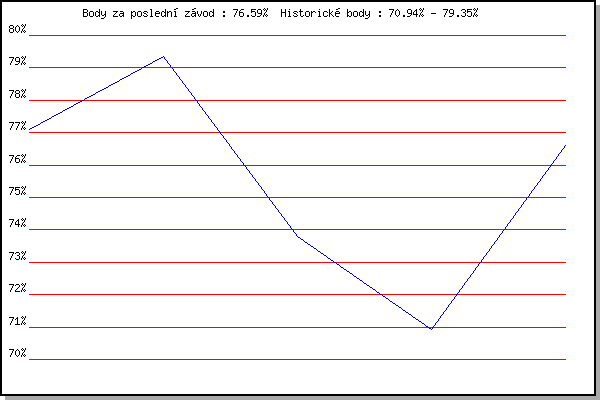 Závod| Body | Výkonnost | Změna | 26.12.2016 | Syrovice | 77.11% | 77.11% | | 26.12.2017 | Syrovice | 79.35% | 78.67% | +1.56% | 10.3.2018 | Myslivna | 73.81% | 77.19% | -1.48% | 17.11.2019 | Jehnice | 70.94% | 75.59% | -1.60% | 26.12.2019 | Syrovice | 76.59% | 75.96% | +0.37% | | |