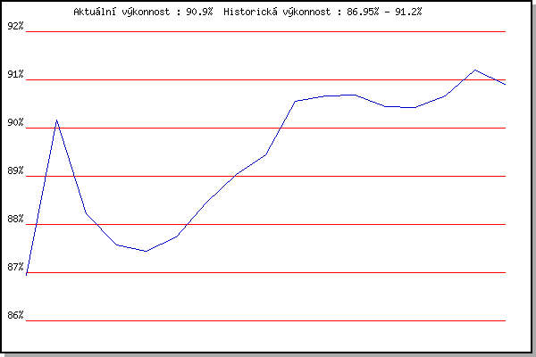 ZávodBodyVýkonnostZměna| 17.11.2007 | 17.listopadu | 86.95% | 86.95% | | | 1.12.2007 | Jehnice | 91.55% | 90.17% | +3.22% | | 26.12.2007 | Syrovice | 84.41% | 88.22% | -1.95% | | 2.2.2008 | Kanice | 86.32% | 87.58% | -0.64% | | 16.2.2008 | Rajecko | 87.10% | 87.44% | -0.14% | | 1.3.2008 | Modrice | 88.35% | 87.74% | +0.30% | | 15.3.2008 | Myslivna | 89.97% | 88.45% | +0.71% | | 29.3.2008 | Cernohorsky soudek | 90.37% | 89.03% | +0.58% | | 22.11.2008 | 17.listopadu | 90.42% | 89.44% | +0.41% | | 6.12.2008 | Jehnice | 93.38% | 90.56% | +1.12% | | 26.12.2008 | Syrovice | 90.95% | 90.66% | +0.10% | | 24.1.2009 | Radostice | 90.77% | 90.69% | +0.03% | | 7.2.2009 | Kanice | 89.50% | 90.44% | -0.25% | | 21.2.2009 | Rajecko | 90.40% | 90.43% | -0.01% | | 7.3.2009 | Modrice | 91.30% | 90.66% | +0.23% | | 21.3.2009 | Myslivna | 92.76% | 91.20% | +0.54% | | 17.11.2011 | Jehnice | 85.70% | 90.90% | -0.30% | | | | |