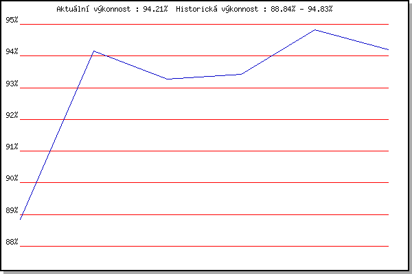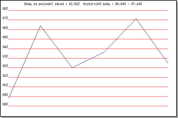 Závod| Body | Výkonnost | Změna | 21.1.2017 | Radostice | 88.84% | 88.84% | | 10.3.2018 | Myslivna | 96.39% | 94.15% | +5.31% | 17.11.2018 | Jehnice | 92.02% | 93.28% | -0.87% | 14.12.2019 | Vranovsky zleb | 93.64% | 93.43% | +0.15% | 26.12.2019 | Syrovice | 97.14% | 94.83% | +1.40% | 4.1.2020 | Kurim | 92.51% | 94.21% | -0.62% | | |
