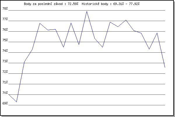 ZávodBodyVýkonnostZměna| 17.11.2017 | Jehnice | 70.03% | 70.03% | | | 2.12.2017 | Okrouhla | 69.31% | 69.71% | -0.32% | | 26.12.2017 | Syrovice | 73.11% | 71.47% | +1.76% | | 6.1.2018 | Kurim | 74.28% | 72.68% | +1.21% | | 20.1.2018 | Radostice | 76.77% | 74.23% | +1.55% | | 27.1.2018 | Rajecko | 76.13% | 74.88% | +0.65% | | 17.2.2018 | Modrice | 76.19% | 75.30% | +0.42% | | 10.3.2018 | Myslivna | 74.49% | 75.11% | -0.19% | | 25.3.2018 | Brnenska prehrada | 76.80% | 75.60% | +0.49% | | 17.11.2018 | Jehnice | 74.75% | 75.41% | -0.19% | | 1.12.2018 | Okrouhla | 77.92% | 76.10% | +0.69% | | 15.12.2018 | Vranovsky zleb | 75.33% | 75.93% | -0.17% | | 26.12.2018 | Syrovice | 74.49% | 75.63% | -0.30% | | 5.1.2019 | Kurim | 76.89% | 75.96% | +0.33% | | 19.1.2019 | Radostice | 76.45% | 76.09% | +0.13% | | 26.1.2019 | Rajecko | 77.08% | 76.34% | +0.25% | | 9.3.2019 | Modrice | 76.07% | 76.28% | -0.06% | | 16.3.2019 | Myslivna | 75.84% | 76.19% | -0.09% | | 7.4.2019 | Brnenska prehrada | 74.30% | 76.04% | -0.15% | | 17.11.2019 | Jehnice | 75.87% | 76.01% | -0.03% | | 7.3.2020 | Modrice | 72.59% | 75.72% | -0.29% | | | | |