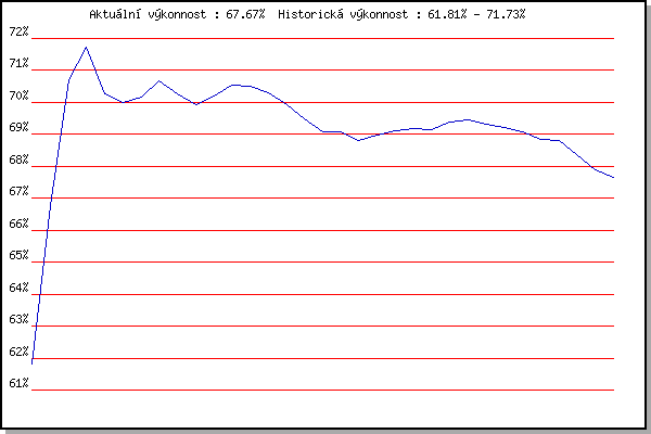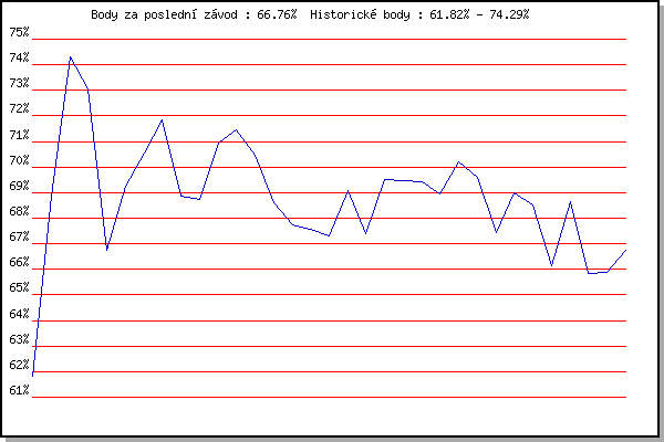 ZávodBodyVýkonnostZměna| 1.12.2007 | Jehnice | 61.82% | 61.81% | | | 2.2.2008 | Kanice | 68.85% | 66.78% | +4.97% | | 16.2.2008 | Rajecko | 74.29% | 70.72% | +3.94% | | 15.3.2008 | Myslivna | 73.07% | 71.73% | +1.01% | | 22.11.2008 | 17.listopadu | 66.74% | 70.28% | -1.45% | | 6.12.2008 | Jehnice | 69.25% | 70.00% | -0.28% | | 5.12.2009 | Okrouhla | 70.56% | 70.18% | +0.18% | | 20.2.2010 | Rajecko | 71.83% | 70.68% | +0.50% | | 17.11.2010 | 17.listopadu | 68.87% | 70.26% | -0.42% | | 4.12.2010 | Okrouhla | 68.73% | 69.92% | -0.34% | | 19.2.2011 | Rajecko | 70.94% | 70.20% | +0.28% | | 17.11.2011 | Jehnice | 71.44% | 70.53% | +0.33% | | 3.12.2011 | Okrouhla | 70.46% | 70.52% | -0.01% | | 1.12.2012 | Okrouhla | 68.59% | 70.29% | -0.23% | | 2.2.2013 | Rajecko | 67.75% | 69.93% | -0.36% | | 17.11.2013 | Jehnice | 67.56% | 69.48% | -0.45% | | 30.11.2013 | Okrouhla | 67.31% | 69.09% | -0.39% | | 26.12.2013 | Syrovice | 69.06% | 69.09% | 0.00% | | 8.2.2014 | Rajecko | 67.41% | 68.80% | -0.29% | | 17.11.2014 | Jehnice | 69.49% | 68.98% | +0.18% | | 6.12.2014 | Okrouhla | 69.48% | 69.10% | +0.12% | | 13.12.2014 | Vranovsky zleb | 69.44% | 69.19% | +0.09% | | 26.12.2014 | Syrovice | 68.96% | 69.14% | -0.05% | | 5.12.2015 | Okrouhla | 70.19% | 69.40% | +0.26% | | 17.11.2016 | Jehnice | 69.58% | 69.45% | +0.05% | | 3.12.2016 | Okrouhla | 67.44% | 69.30% | -0.15% | | 17.11.2017 | Jehnice | 68.98% | 69.23% | -0.07% | | 2.12.2017 | Okrouhla | 68.50% | 69.09% | -0.14% | | 27.1.2018 | Rajecko | 66.14% | 68.85% | -0.24% | | 17.11.2018 | Jehnice | 68.63% | 68.80% | -0.05% | | 1.12.2018 | Okrouhla | 65.85% | 68.38% | -0.42% | | 30.11.2019 | Okrouhla | 65.88% | 67.89% | -0.49% | | 25.1.2020 | Rajecko | 66.76% | 67.67% | -0.22% | | | | |