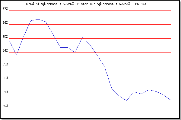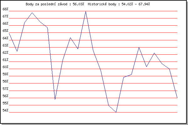 ZávodBodyVýkonnostZměna| 2.12.2017 | Okrouhla | 64.89% | 64.89% | | | 9.12.2017 | Vranovsky zleb | 62.41% | 63.80% | -1.09% | | 26.12.2017 | Syrovice | 66.42% | 65.16% | +1.36% | | 6.1.2018 | Kurim | 67.77% | 66.28% | +1.12% | | 20.1.2018 | Radostice | 66.52% | 66.37% | +0.09% | | 17.2.2018 | Modrice | 65.69% | 66.19% | -0.18% | | 10.3.2018 | Myslivna | 55.78% | 65.29% | -0.90% | | 25.3.2018 | Brnenska prehrada | 61.26% | 64.34% | -0.95% | | 26.12.2018 | Syrovice | 64.34% | 64.34% | 0.00% | | 5.1.2019 | Kurim | 62.75% | 63.99% | -0.35% | | 19.1.2019 | Radostice | 67.94% | 65.09% | +1.10% | | 26.1.2019 | Rajecko | 62.53% | 64.55% | -0.54% | | 9.3.2019 | Modrice | 59.81% | 63.82% | -0.73% | | 16.3.2019 | Myslivna | 54.95% | 62.95% | -0.87% | | 7.4.2019 | Brnenska prehrada | 54.02% | 61.38% | -1.57% | | 17.11.2019 | Jehnice | 58.82% | 60.86% | -0.52% | | 30.11.2019 | Okrouhla | 59.22% | 60.53% | -0.33% | | 14.12.2019 | Vranovsky zleb | 62.97% | 61.16% | +0.63% | | 26.12.2019 | Syrovice | 60.32% | 60.99% | -0.17% | | 4.1.2020 | Kurim | 62.22% | 61.30% | +0.31% | | 18.1.2020 | Radostice | 60.75% | 61.19% | -0.11% | | 25.1.2020 | Rajecko | 60.00% | 60.95% | -0.24% | | 7.3.2020 | Modrice | 56.03% | 60.56% | -0.39% | | | | |
