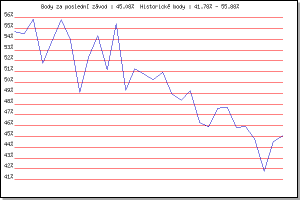 ZávodBodyVýkonnostZměna| 1.12.2007 | Jehnice | 54.72% | 54.73% | | | 26.12.2007 | Syrovice | 54.53% | 54.64% | -0.09% | | 5.1.2008 | Krenovice | 55.88% | 55.28% | +0.64% | | 19.1.2008 | Radostice | 51.80% | 54.57% | -0.71% | | 2.2.2008 | Kanice | 53.79% | 54.34% | -0.23% | | 16.2.2008 | Rajecko | 55.82% | 54.85% | +0.51% | | 1.3.2008 | Modrice | 54.02% | 54.64% | -0.21% | | 15.3.2008 | Myslivna | 49.09% | 54.10% | -0.54% | | 29.3.2008 | Cernohorsky soudek | 52.41% | 53.71% | -0.39% | | 21.11.2009 | 17.listopadu | 54.34% | 53.89% | +0.18% | | 5.12.2009 | Okrouhla | 51.20% | 53.31% | -0.58% | | 26.12.2009 | Syrovice | 55.44% | 53.89% | +0.58% | | 9.1.2010 | Kurim | 49.28% | 53.34% | -0.55% | | 23.1.2010 | Radostice | 51.29% | 52.92% | -0.42% | | 6.2.2010 | Kanice | 50.75% | 52.48% | -0.44% | | 20.2.2010 | Rajecko | 50.28% | 52.03% | -0.45% | | 6.3.2010 | Modrice | 50.94% | 51.81% | -0.22% | | 21.3.2010 | Myslivna | 48.94% | 51.48% | -0.33% | | 3.4.2010 | Cernohorsky soudek | 48.35% | 50.97% | -0.51% | | 19.2.2011 | Rajecko | 49.24% | 50.63% | -0.34% | | 5.3.2011 | Modrice | 46.27% | 50.21% | -0.42% | | 26.3.2011 | Myslivna | 45.91% | 49.44% | -0.77% | | 2.4.2011 | Cernohorsky soudek | 47.60% | 49.07% | -0.37% | | 9.3.2013 | Modrice | 47.72% | 48.81% | -0.26% | | 6.4.2013 | Soudek Vinice | 45.85% | 48.36% | -0.45% | | 30.11.2013 | Okrouhla | 45.89% | 47.87% | -0.49% | | 14.12.2013 | Vranovsky zleb | 44.73% | 47.48% | -0.39% | | 8.2.2014 | Rajecko | 41.78% | 46.94% | -0.54% | | 8.3.2014 | Modrice | 44.50% | 46.45% | -0.49% | | 15.3.2014 | Myslivna | 45.08% | 46.18% | -0.27% | | | | |