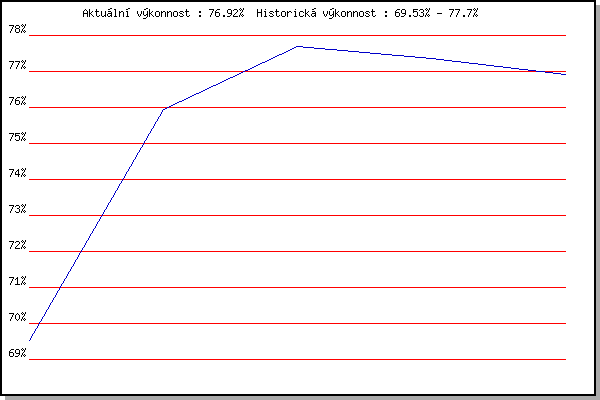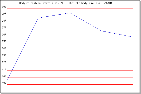 Závod| Body | Výkonnost | Změna | 25.3.2018 | Brnenska prehrada | 69.53% | 69.53% | | 26.12.2019 | Syrovice | 78.59% | 75.93% | +6.40% | 18.1.2020 | Radostice | 79.34% | 77.70% | +1.77% | 25.1.2020 | Rajecko | 76.73% | 77.37% | -0.33% | 7.3.2020 | Modrice | 75.87% | 76.92% | -0.45% | | |