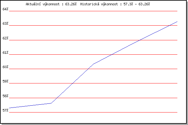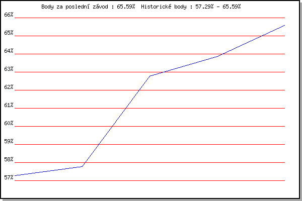 Závod| Body | Výkonnost | Změna | 17.11.2018 | Jehnice | 57.29% | 57.30% | | 19.1.2019 | Radostice | 57.78% | 57.63% | +0.33% | 9.3.2019 | Modrice | 62.77% | 60.32% | +2.69% | 16.3.2019 | Myslivna | 63.85% | 61.84% | +1.52% | 7.4.2019 | Brnenska prehrada | 65.59% | 63.26% | +1.42% | | |