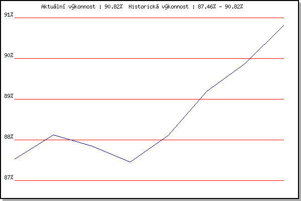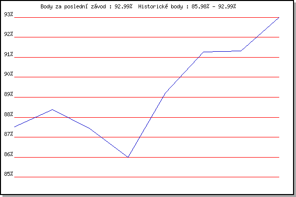 Závod| Body | Výkonnost | Změna | 15.12.2018 | Vranovsky zleb | 87.52% | 87.53% | | 5.1.2019 | Kurim | 88.39% | 88.12% | +0.59% | 26.1.2019 | Rajecko | 87.42% | 87.85% | -0.27% | 9.3.2019 | Modrice | 85.98% | 87.46% | -0.39% | 17.11.2019 | Jehnice | 89.21% | 88.11% | +0.65% | 14.12.2019 | Vranovsky zleb | 91.28% | 89.20% | +1.09% | 4.1.2020 | Kurim | 91.32% | 89.88% | +0.68% | 25.1.2020 | Rajecko | 92.99% | 90.82% | +0.94% | | |